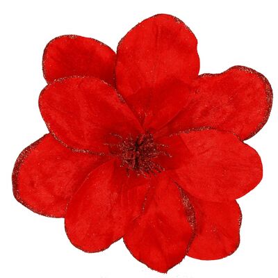 Umelý kvet červenej magnólie so zamatovými okvetnými lístkami. Realistické spracovanie, ohybná stonka. Vhodné do rôznych vianočných aranžmánov, na výzdobu stromčeka alebo ako samostatná dekorácia. Veľkosť 24x31 cm, červená farba.