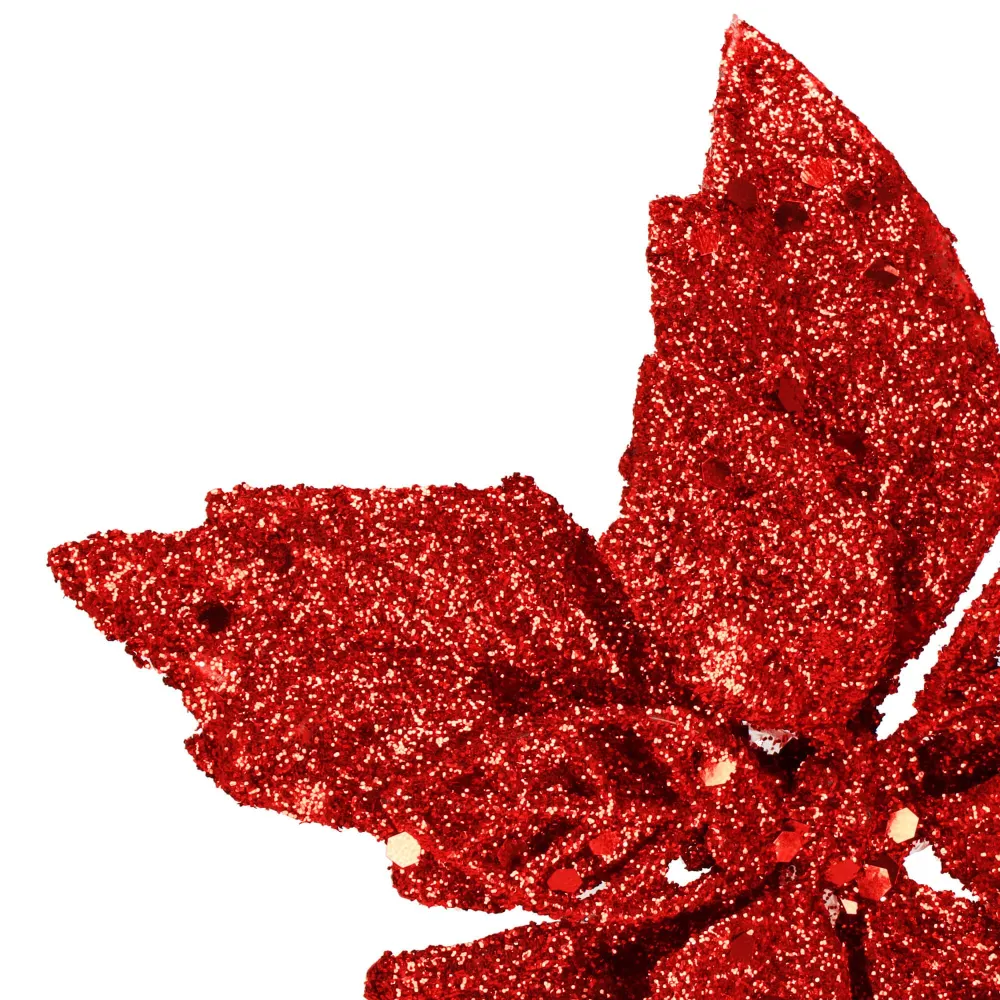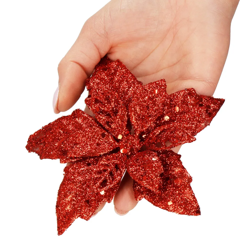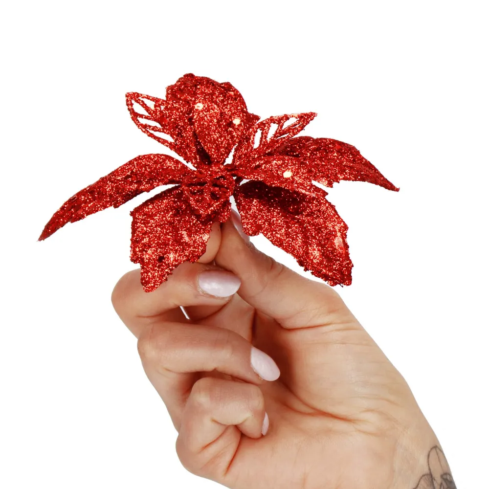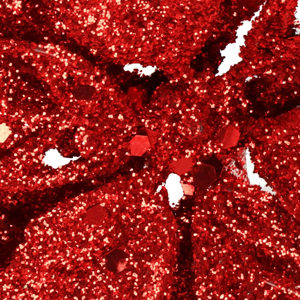 Umelý kvet červenej vianočnej ruže s okvetnými lístkami zdobenými trblietkami. Realistické spracovanie, spodný tŕň pre ľahké uchytenie, napr. pomocou viazacieho povrázku, do rôznych vianočných aranžmánov. Skvele sa tiež hodí ako ozdoba stromčeka alebo ako samostatná dekorácia. Veľkosť 13x13 cm, červená farba.
