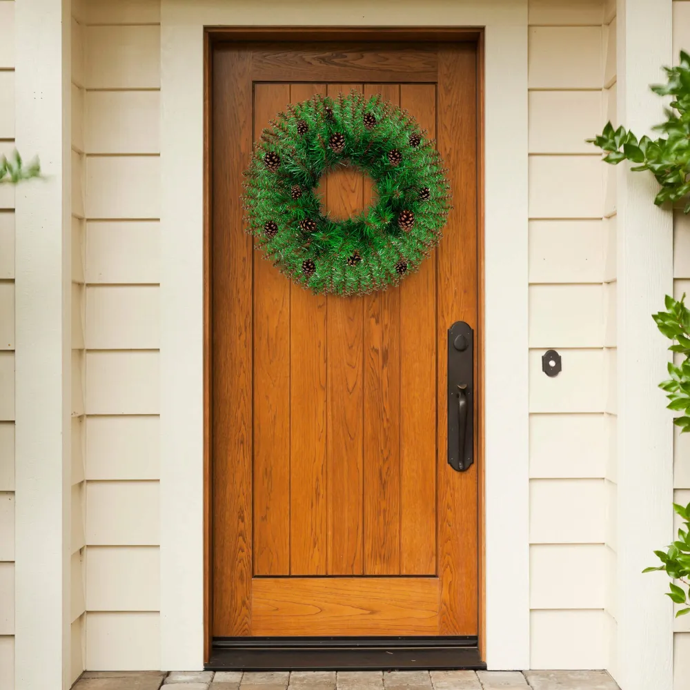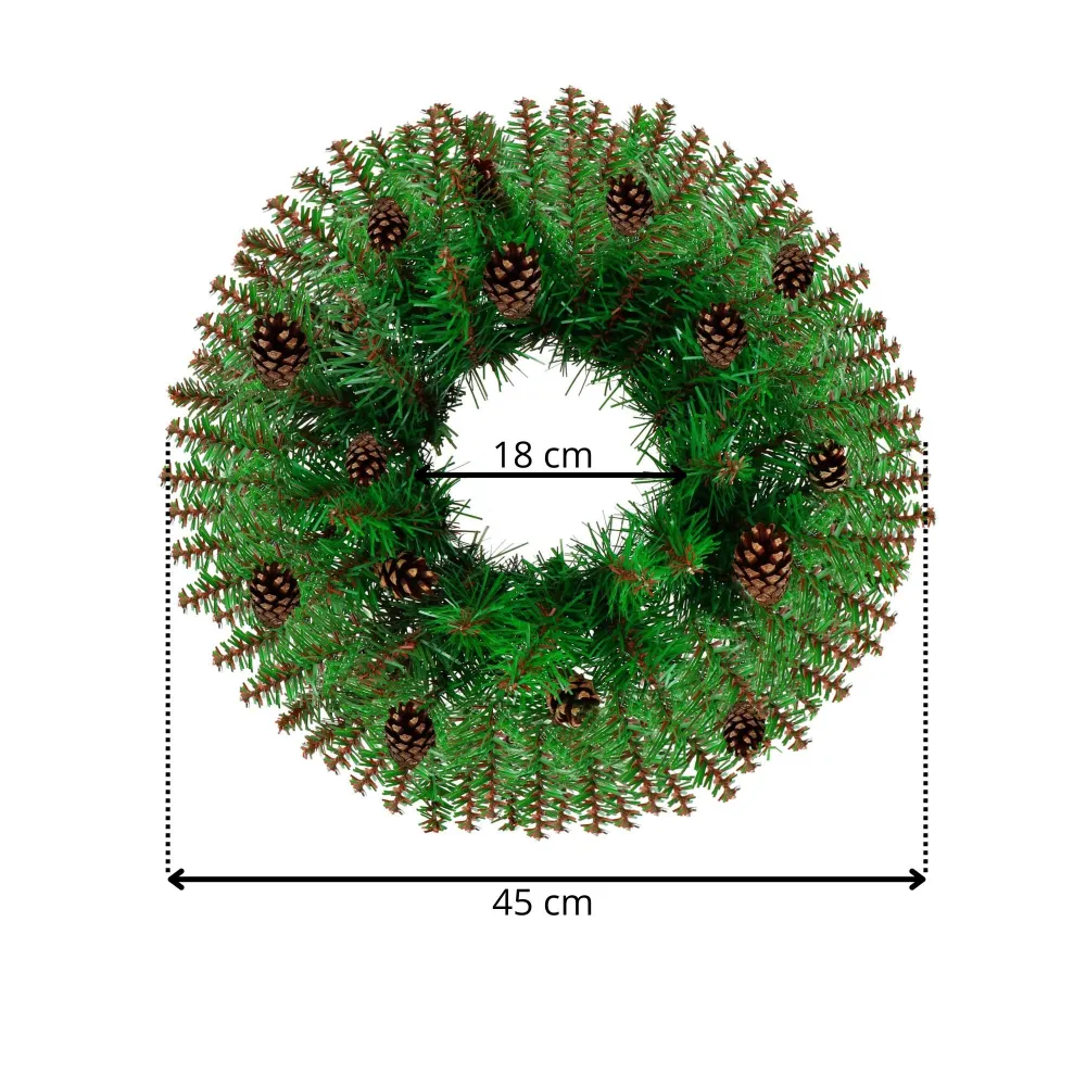 Extra hustý vianočný veniec s priemerom 45 cm. Nádherne zdobený šiškami s možnosťou vlastného dozdobenia osvetlením a inými ozdobami na vytvorenie jedinečnej sviatočnej dekorácie. Ideálne ako adventný veniec na dvere, stôl a ďalšie miesta. Na vnútorné aj vonkajšie použitie.