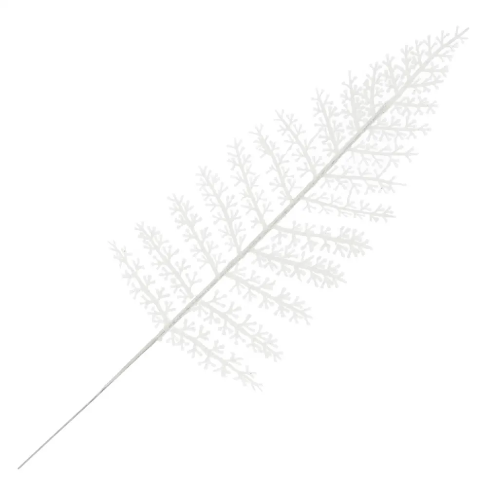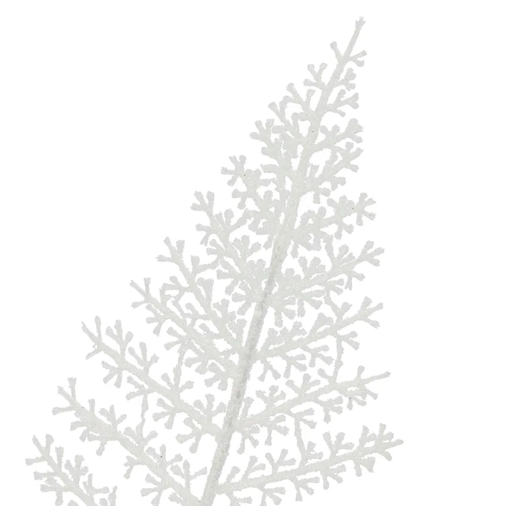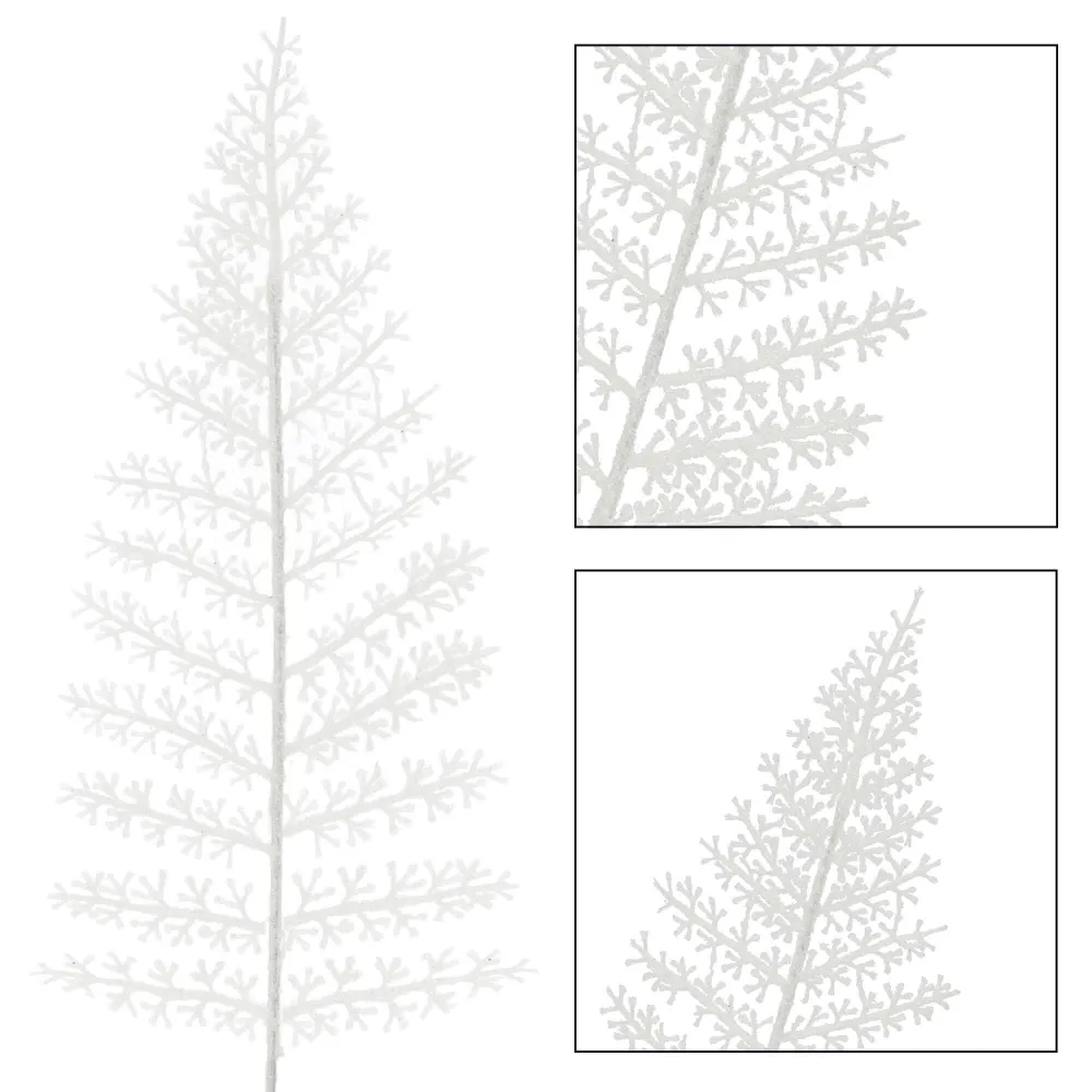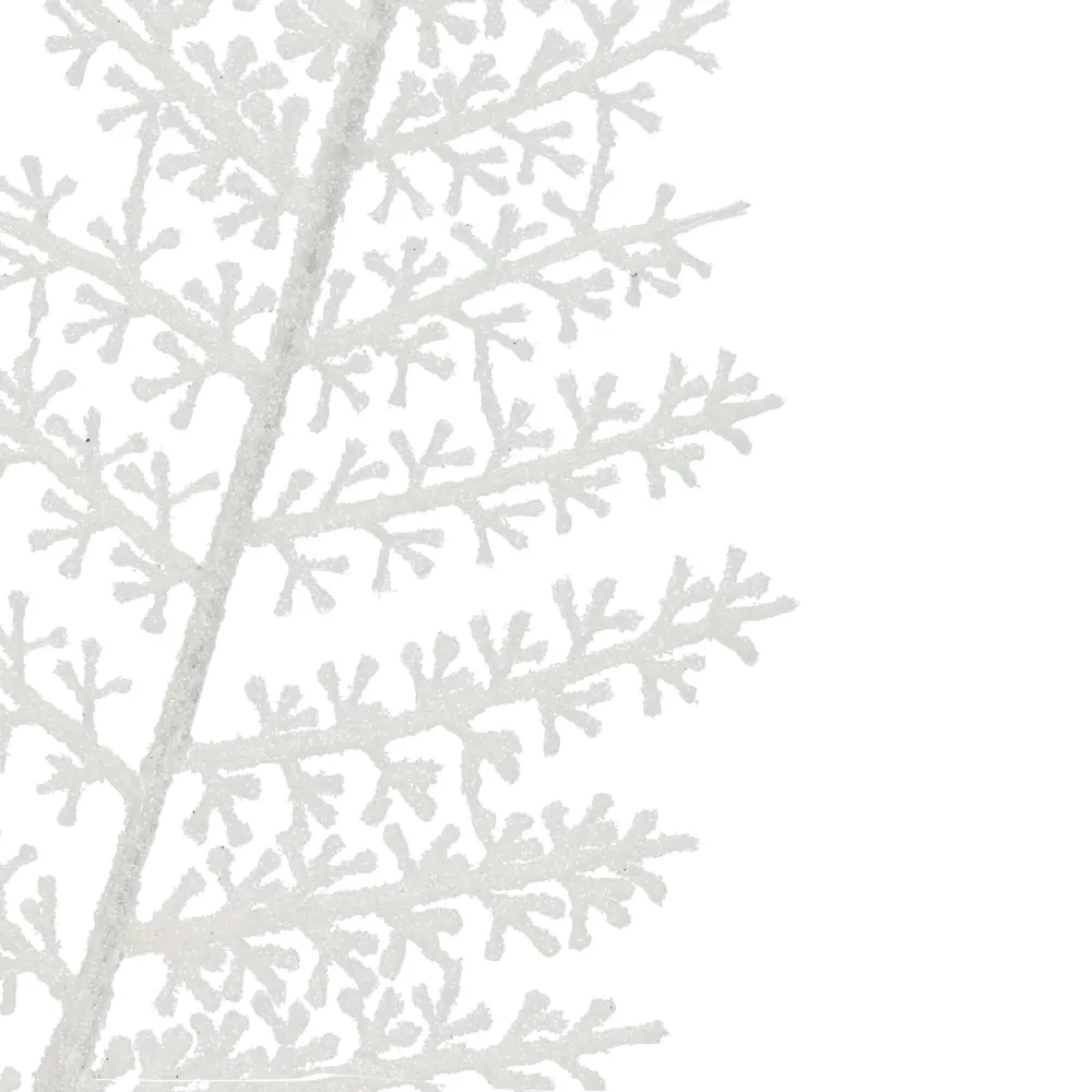 Elegantná dekoratívna vetvička v tvare paprade dodá vianočným aranžmánom jemný a slávnostný nádych. Biele prevedenie krásne odráža svetlo a vytvára efektný ligot. Ideálne do svietnikov, vencov, kytíc alebo ako doplnok k stromčeku či stolnú dekoráciu. Dĺžka 44 cm, šírka 13 cm.