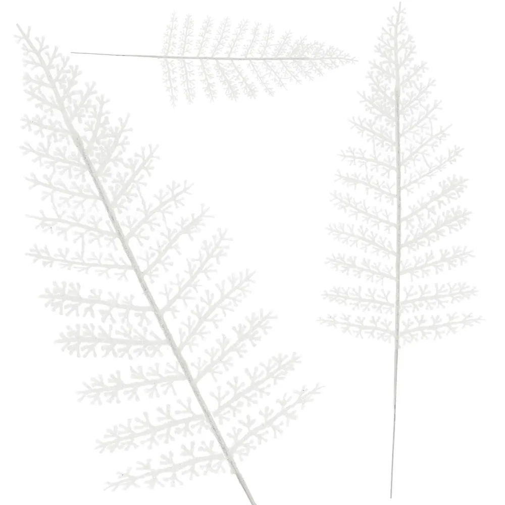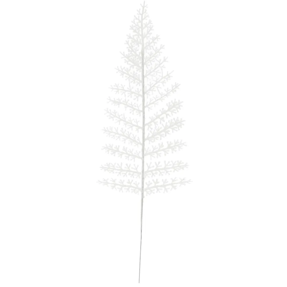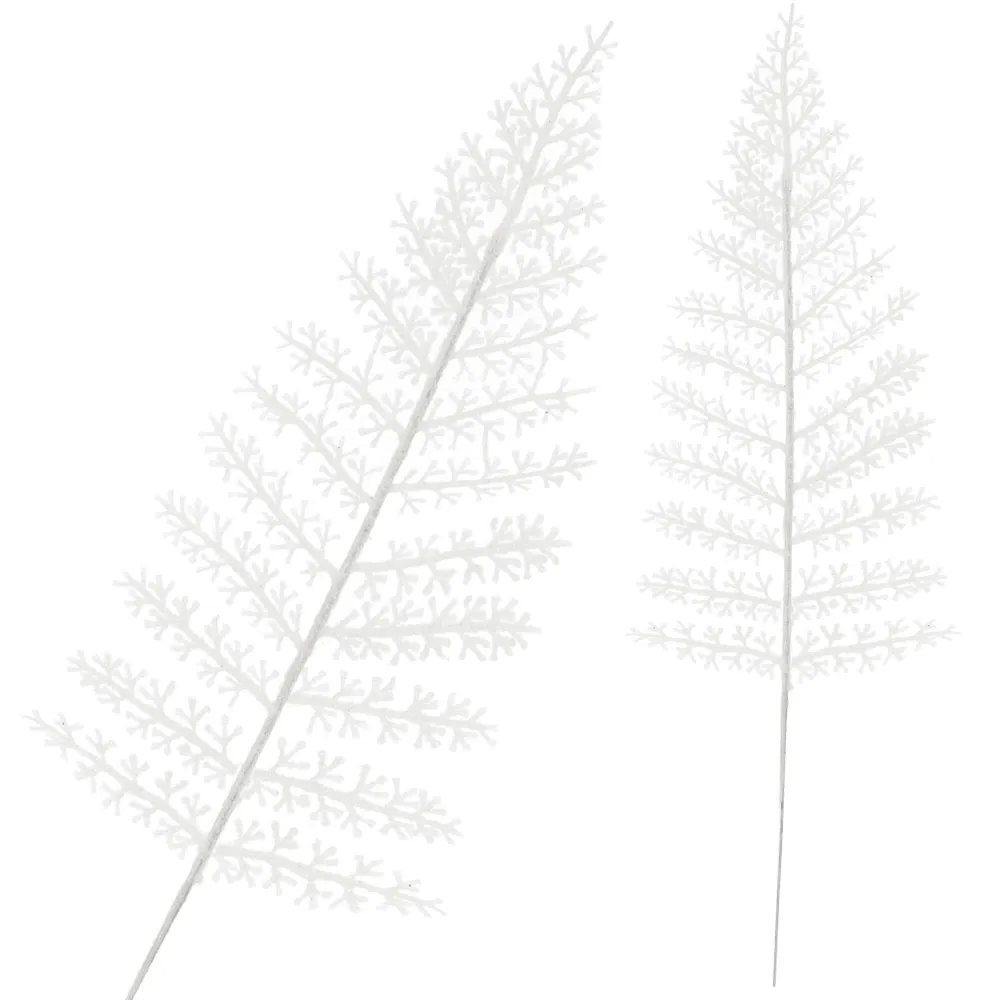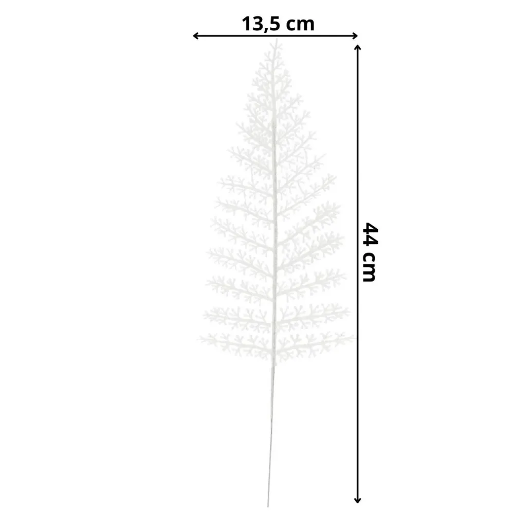 Elegantná dekoratívna vetvička v tvare paprade dodá vianočným aranžmánom jemný a slávnostný nádych. Biele prevedenie krásne odráža svetlo a vytvára efektný ligot. Ideálne do svietnikov, vencov, kytíc alebo ako doplnok k stromčeku či stolnú dekoráciu. Dĺžka 44 cm, šírka 13 cm.