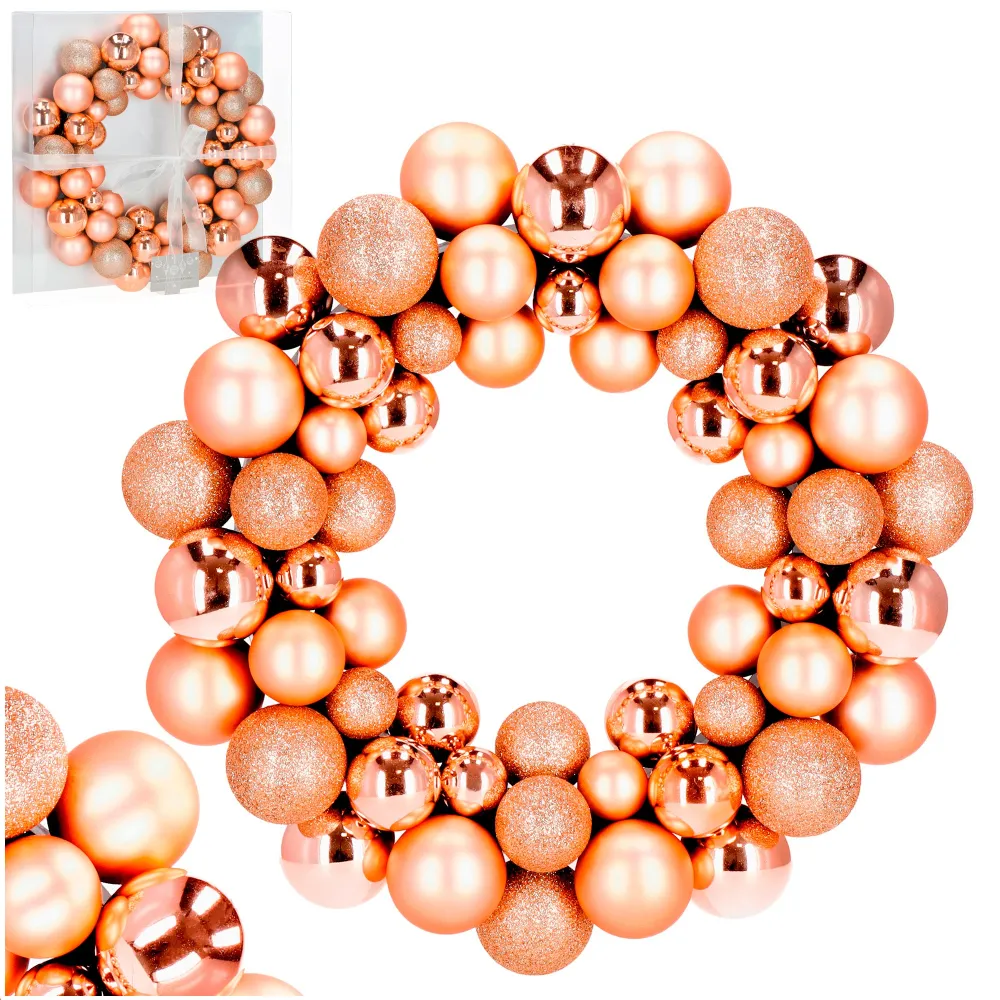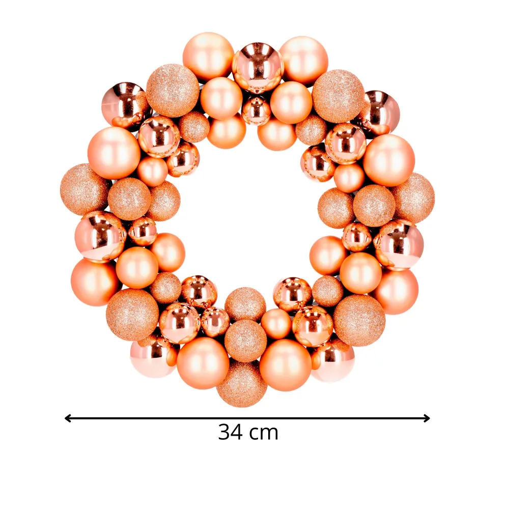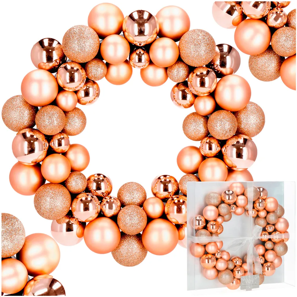 Elegantný vianočný veniec v odtieni ružového zlata dodá vášmu domovu slávnostný a moderný vzhľad. Vyrobený z nerozbitného plastového materiálu, ideálny na zavesenie na dvere alebo ako dekorácia na sviatočný stôl. Súčasťou je pútko na ľahké zavesenie. Vhodný pre vnútorné aj vonkajšie použitie. Priemer 34 cm.