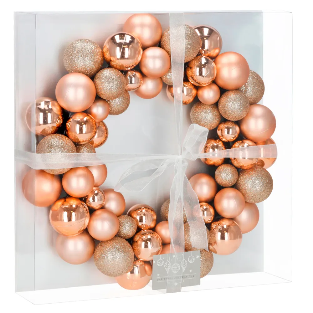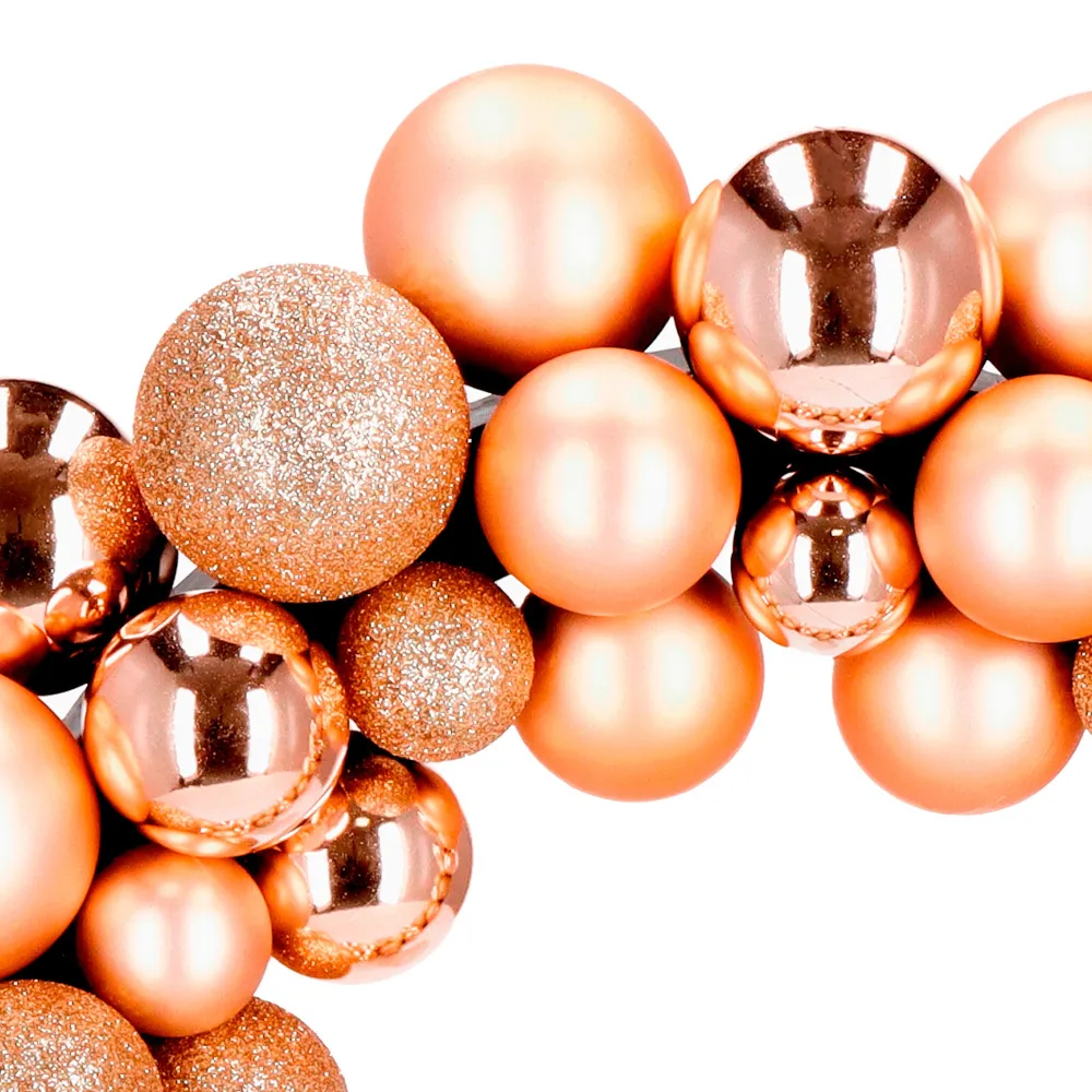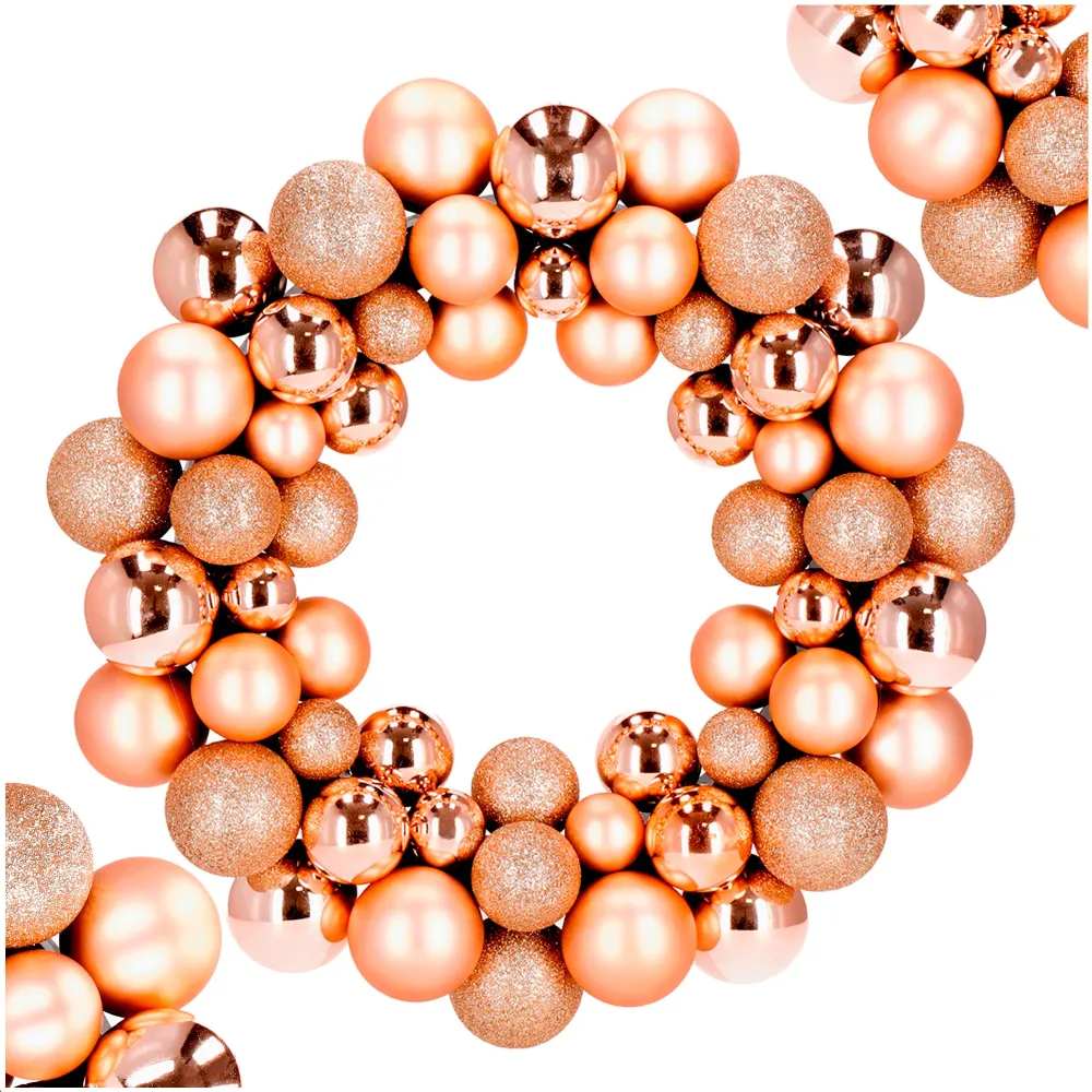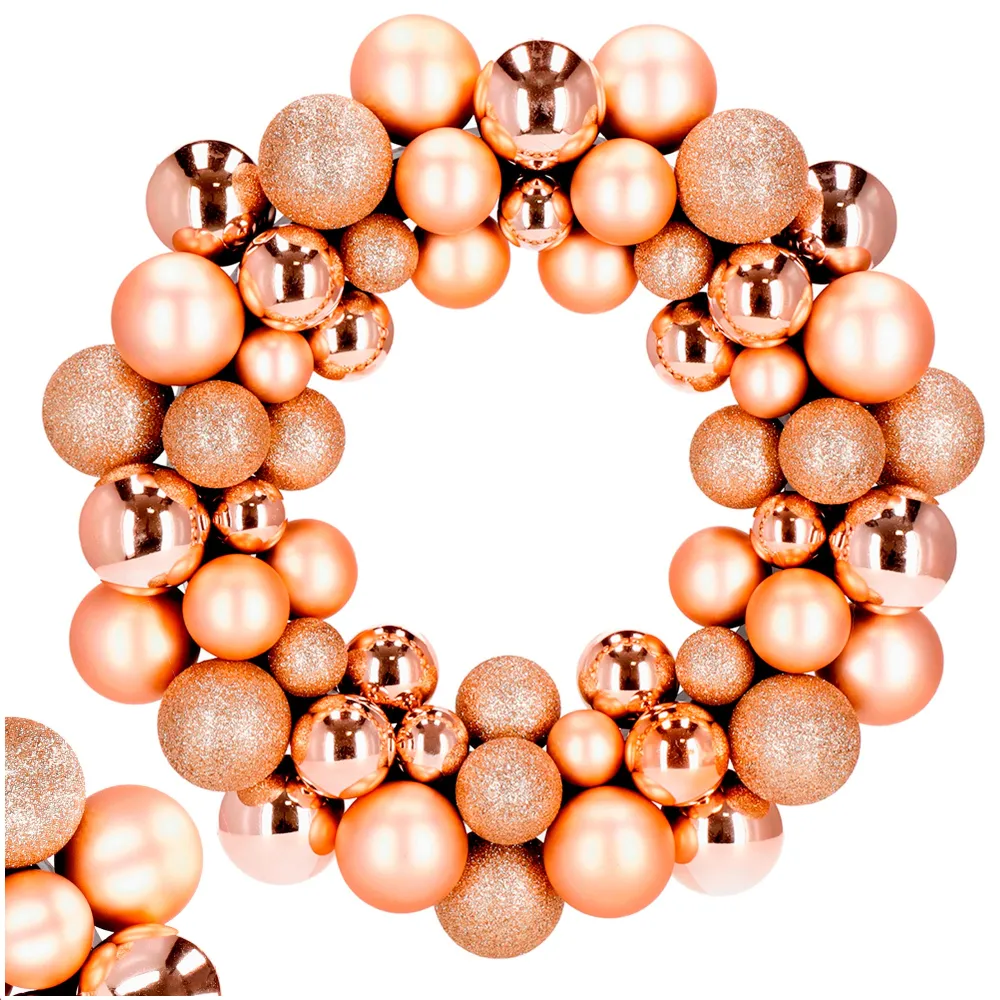 Elegantný vianočný veniec v odtieni ružového zlata dodá vášmu domovu slávnostný a moderný vzhľad. Vyrobený z nerozbitného plastového materiálu, ideálny na zavesenie na dvere alebo ako dekorácia na sviatočný stôl. Súčasťou je pútko na ľahké zavesenie. Vhodný pre vnútorné aj vonkajšie použitie. Priemer 34 cm.