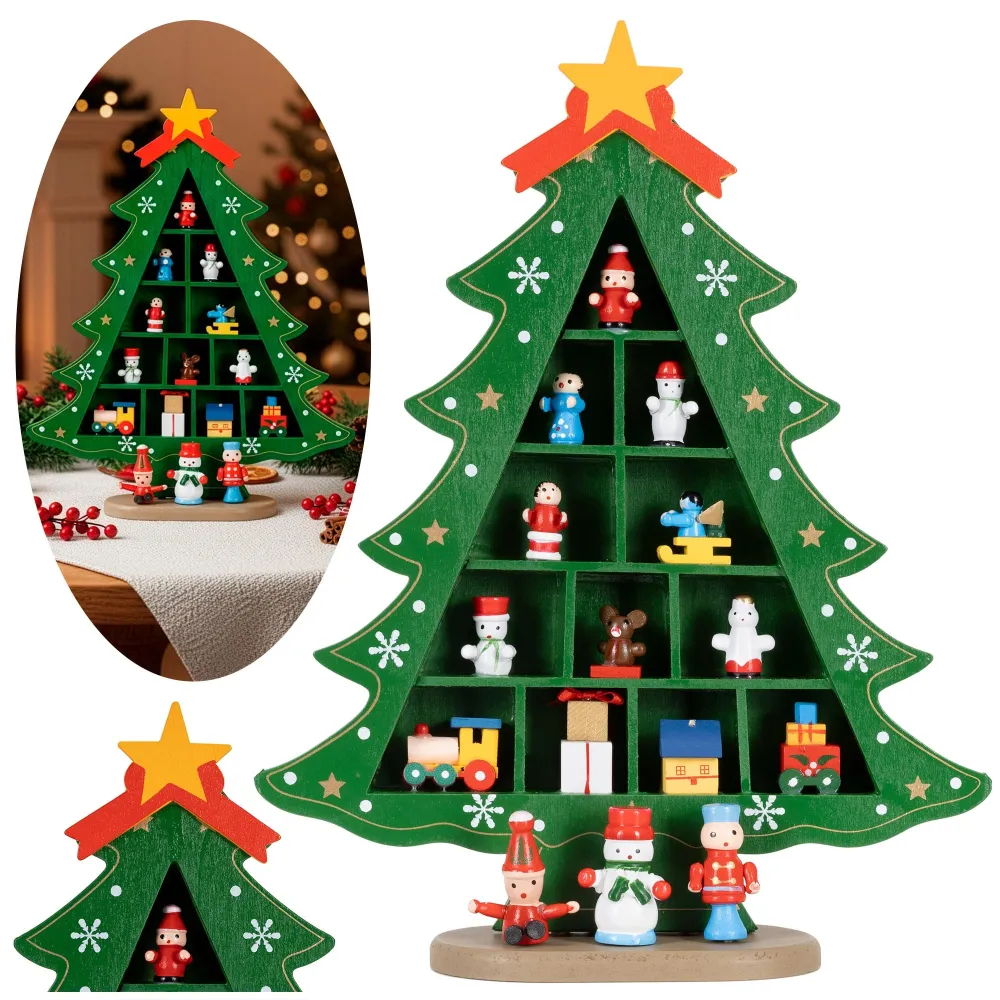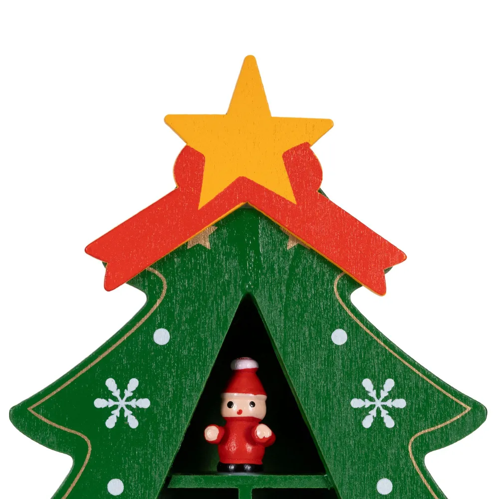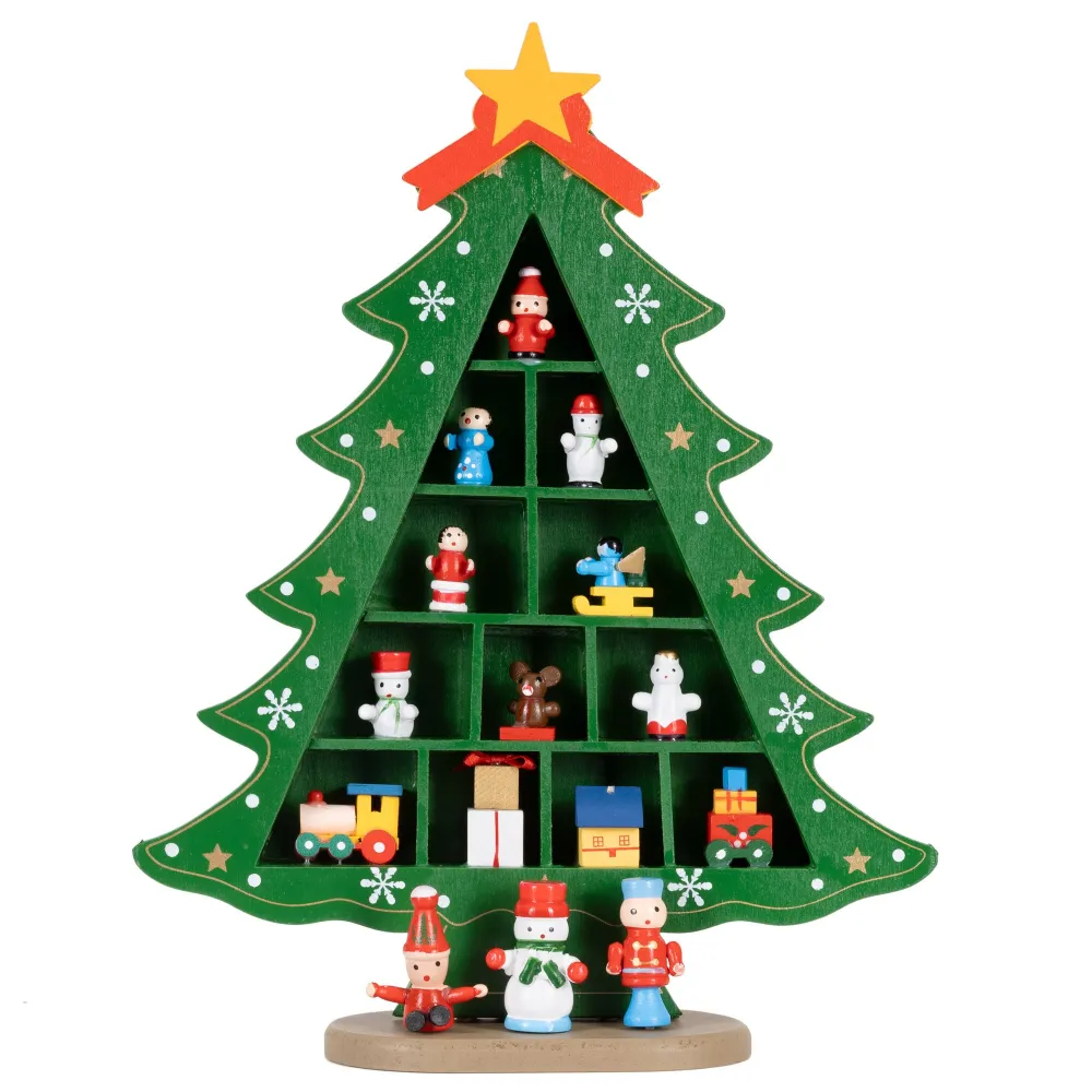 Zelený drevený vianočný stromček s pevne pripevnenými ozdobami krásne doplní sviatočnú výzdobu. Vďaka pevnému materiálu pôsobí kvalitne, je stabilný a znova použiteľný, takže vám bude slúžiť mnoho rokov. Súčasťou je 15 detailne spracovaných figúrok, ktoré tvoria pôvabnú dekoratívnu scénu. Ideálna na policu, komodu či do detskej izby, kde navodí veselú vianočnú atmosféru.