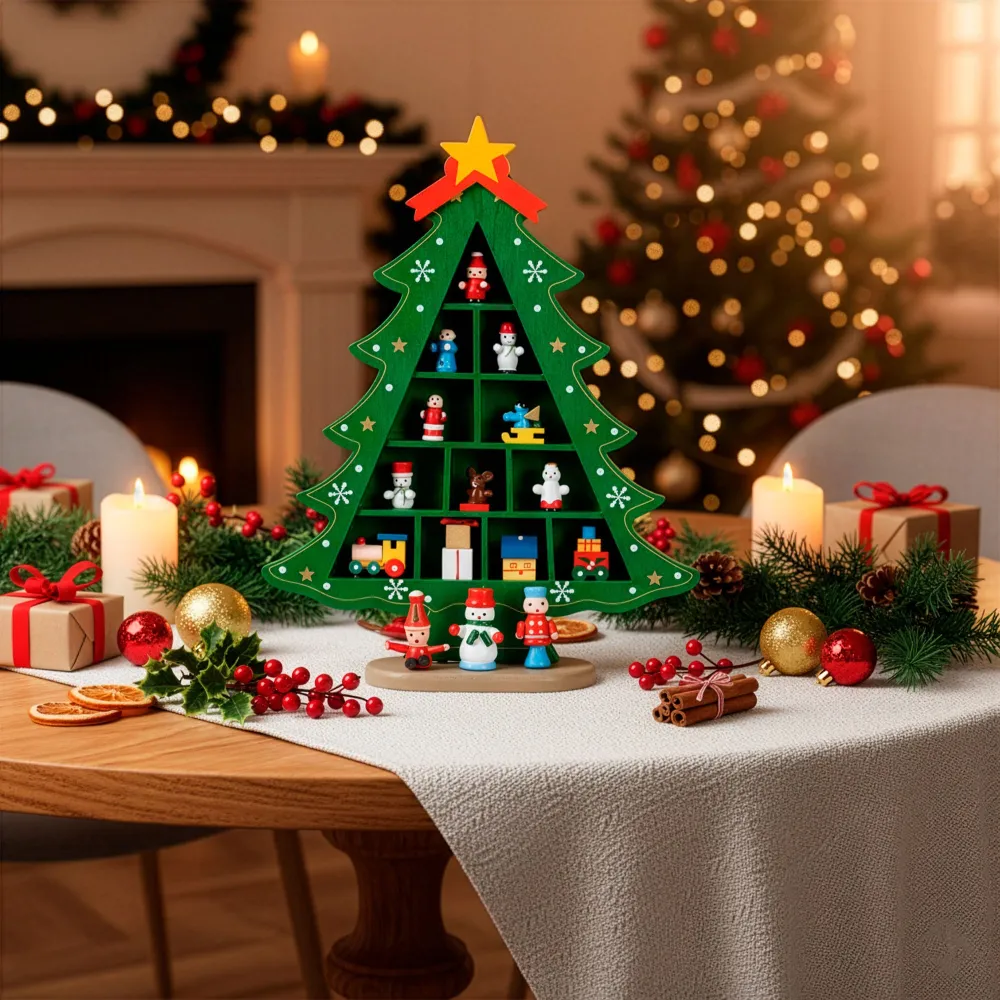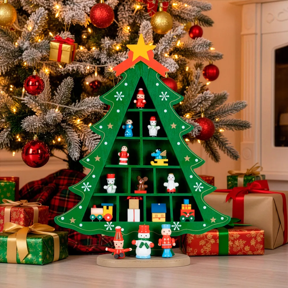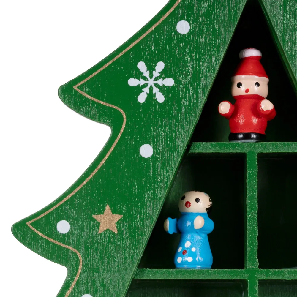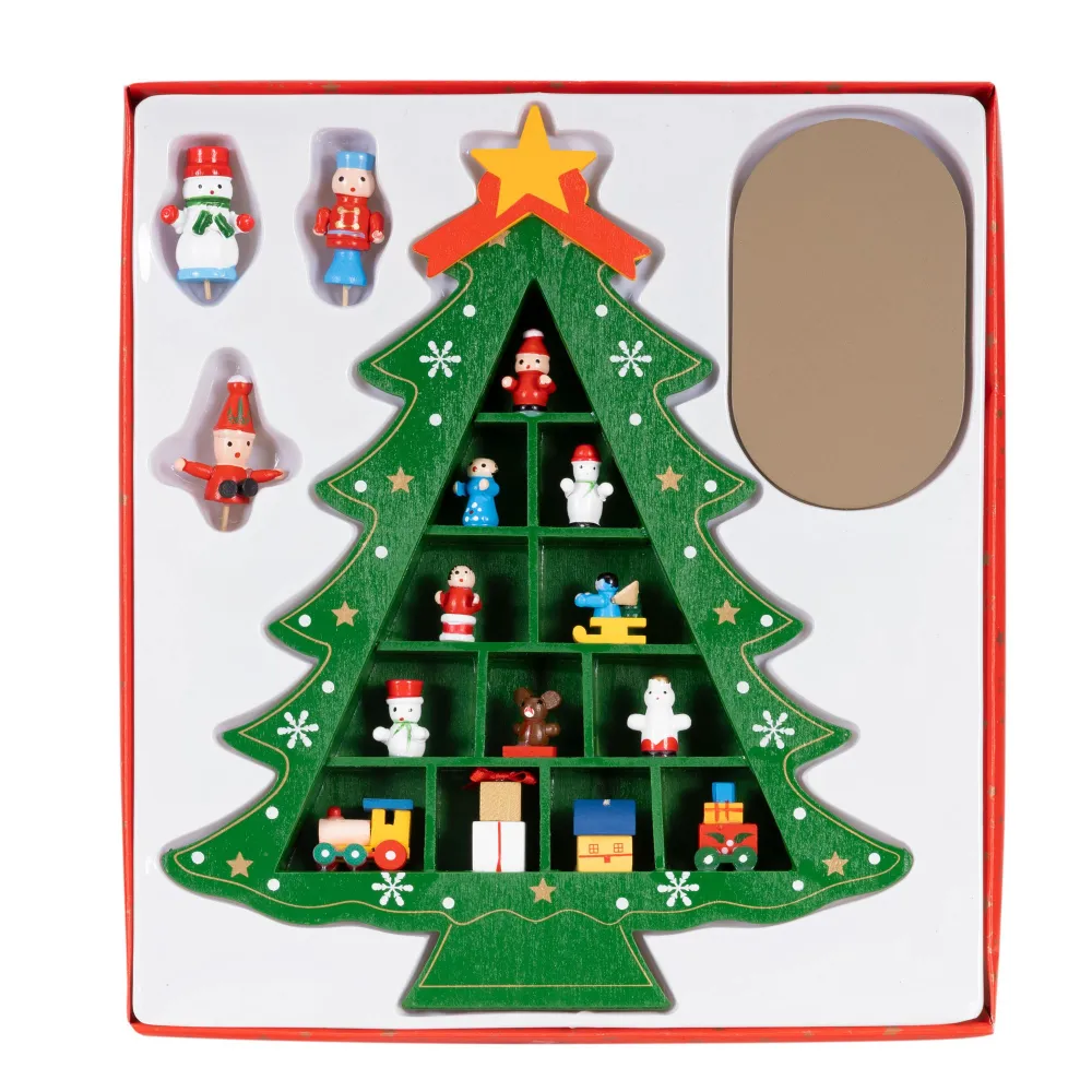 Zelený drevený vianočný stromček s pevne pripevnenými ozdobami krásne doplní sviatočnú výzdobu. Vďaka pevnému materiálu pôsobí kvalitne, je stabilný a znova použiteľný, takže vám bude slúžiť mnoho rokov. Súčasťou je 15 detailne spracovaných figúrok, ktoré tvoria pôvabnú dekoratívnu scénu. Ideálna na policu, komodu či do detskej izby, kde navodí veselú vianočnú atmosféru.