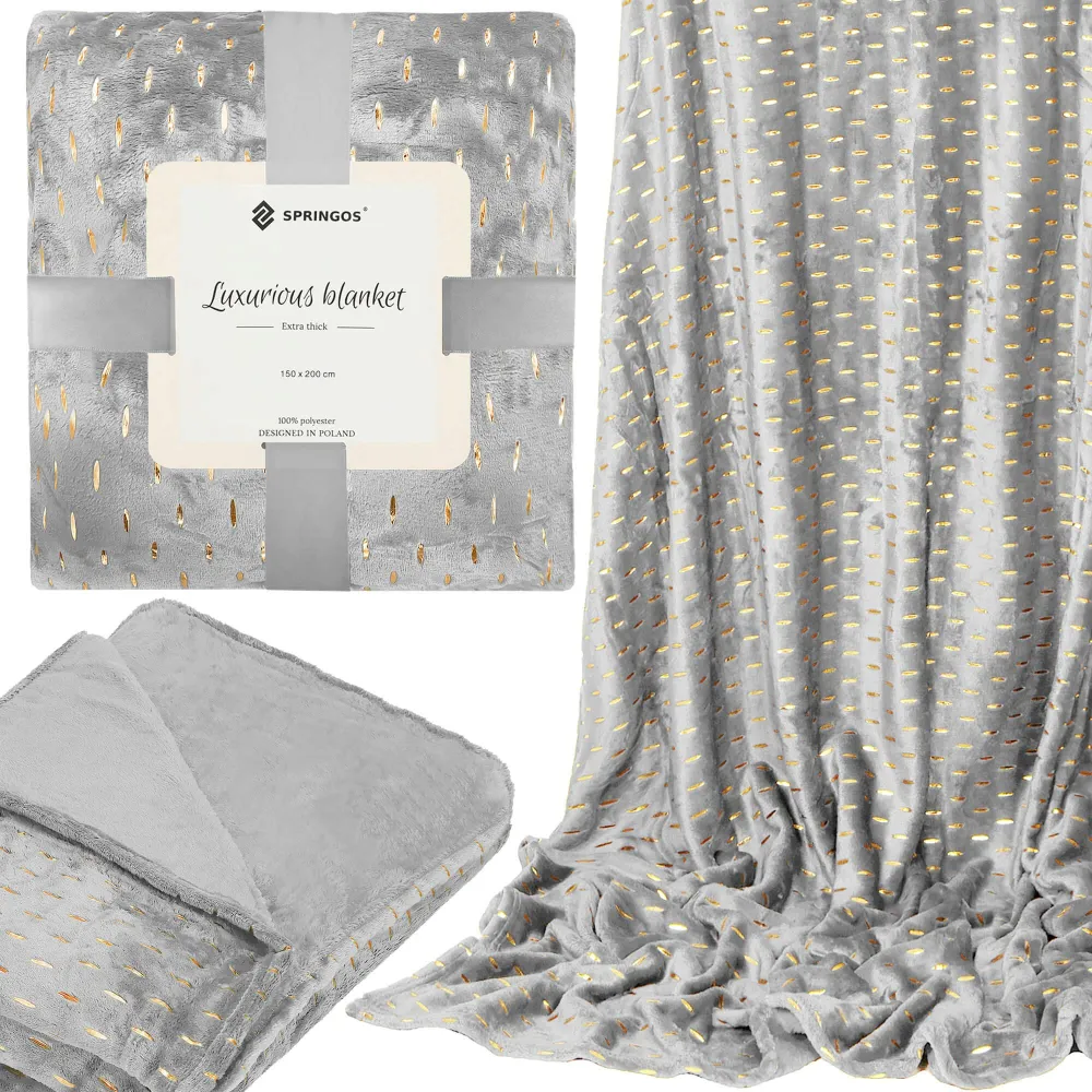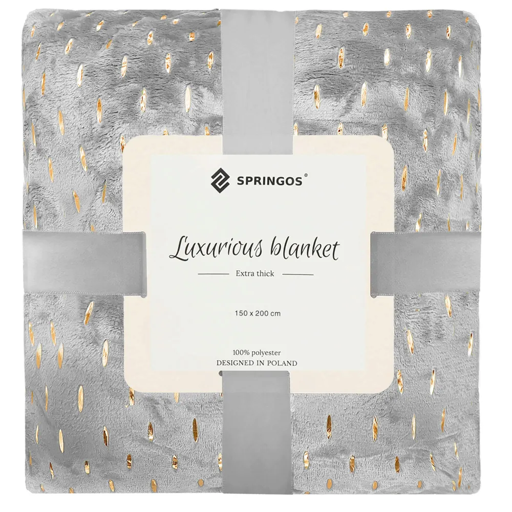 Obojstranná deka SPRINGOS EMBER je elegantný a praktický doplnok do vášho domova Jedna strana deky je plyšová so zlatým vzorom, zatiaľ čo druhá strana je hladká, bez potlače. , ale aj ako prehoz. Je krásne zabalená a previazaná stuhou, čo z nej robí. skvelý darček.