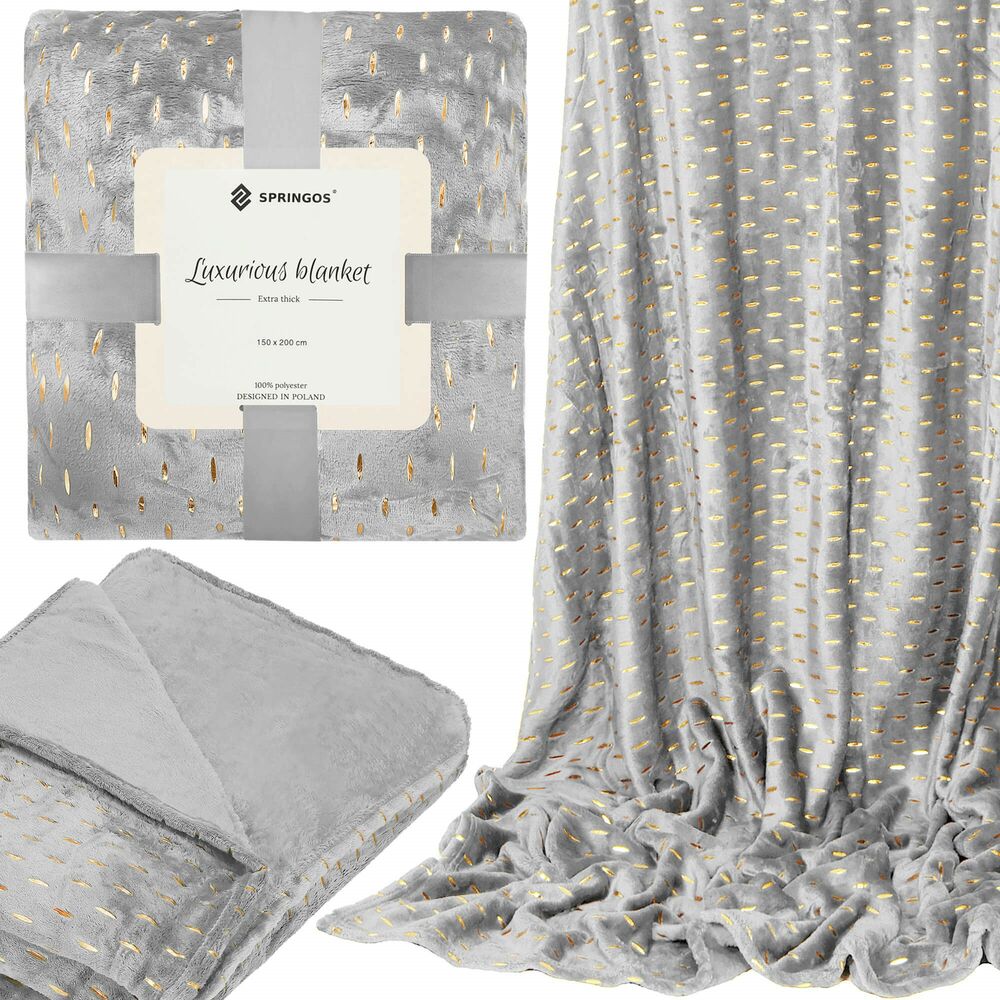 Obojstranná deka SPRINGOS EMBER je elegantný a praktický doplnok do vášho domova. Jedna strana deky je plyšová so zlatým vzorom, zatiaľ čo druhá strana je hladká, bez potlače. Deka je mäkká, hrejivá a hebká na dotyk. Nevyžaduje žehlenie a je možné ju využiť nielen ako deku, ale aj ako prehoz. Je krásne zabalená a previazaná stuhou, čo z nej robí skvelý darček.