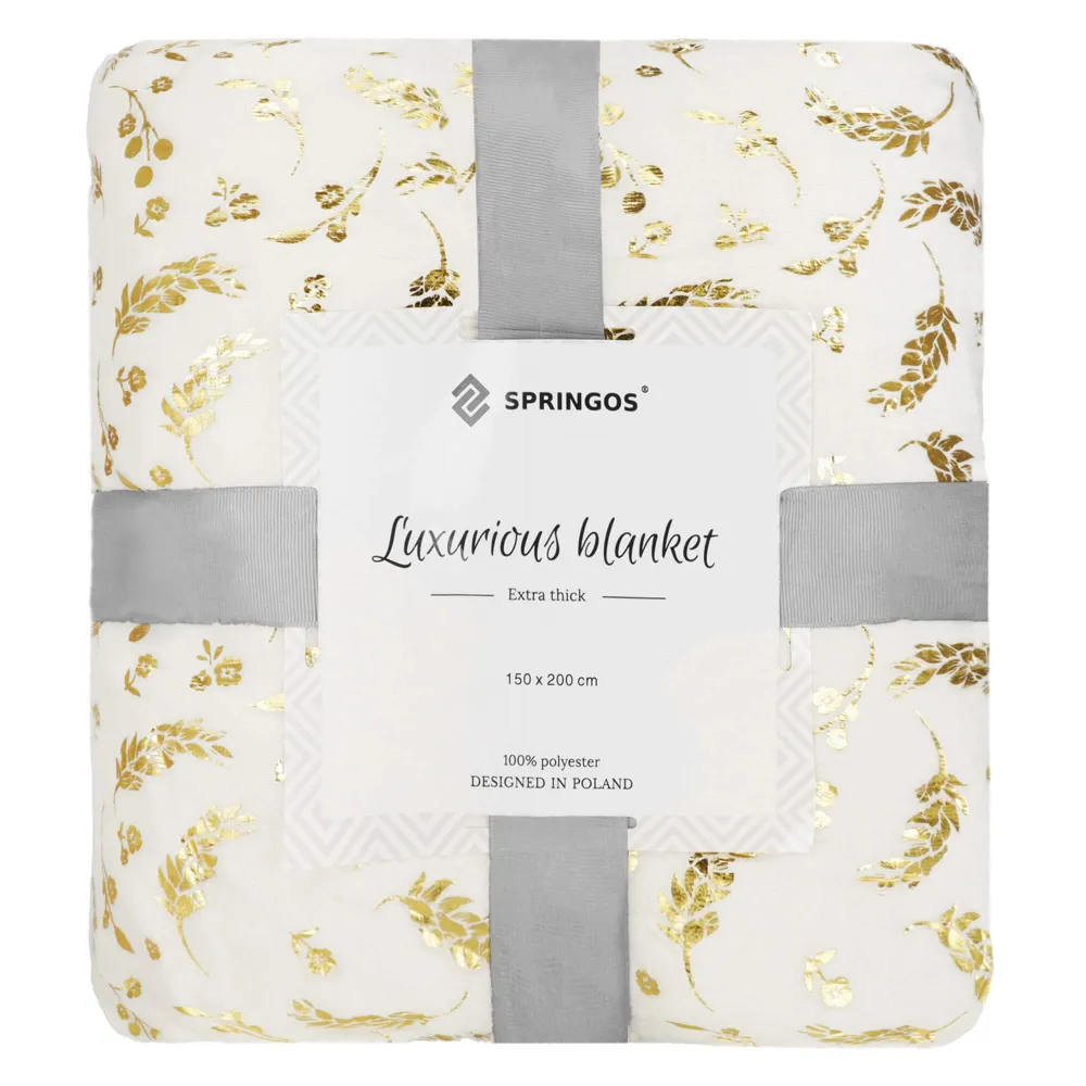 Obojstranná deka SPRINGOS FLORAL je elegantný a praktický doplnok do vášho domova. Jedna strana deky je plyšová s krásnym kvetinovým vzorom zlatej farby, zatiaľ čo druhá strana je hladká, bez potlače. Deka je mäkká, hrejivá a hebká na dotyk. Nevyžaduje žehlenie a je možné ju využiť nielen ako deku, ale aj ako prehoz. Je krásne zabalená a previazaná stuhou, čo z nej robí skvelý darček.