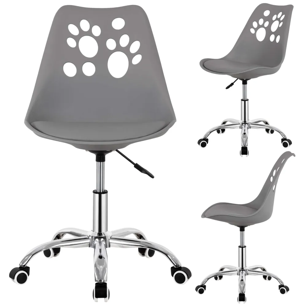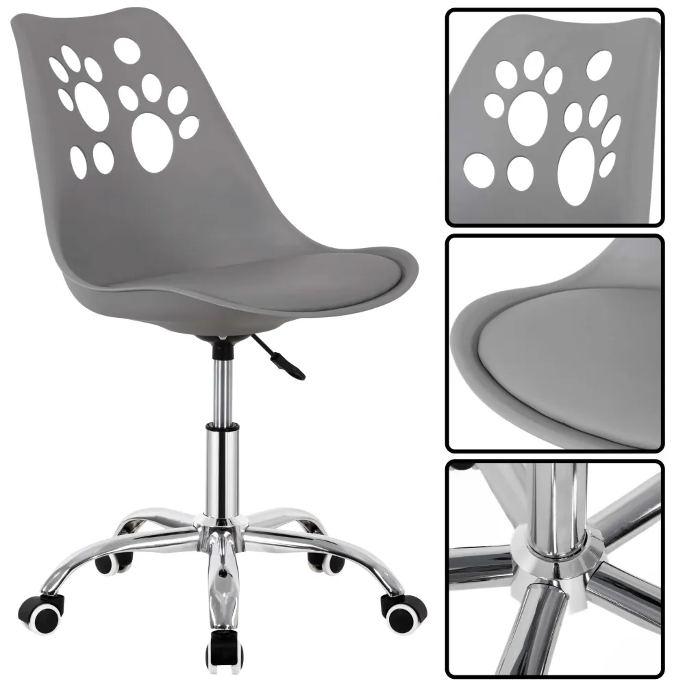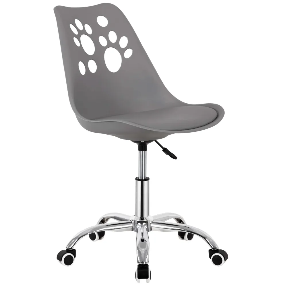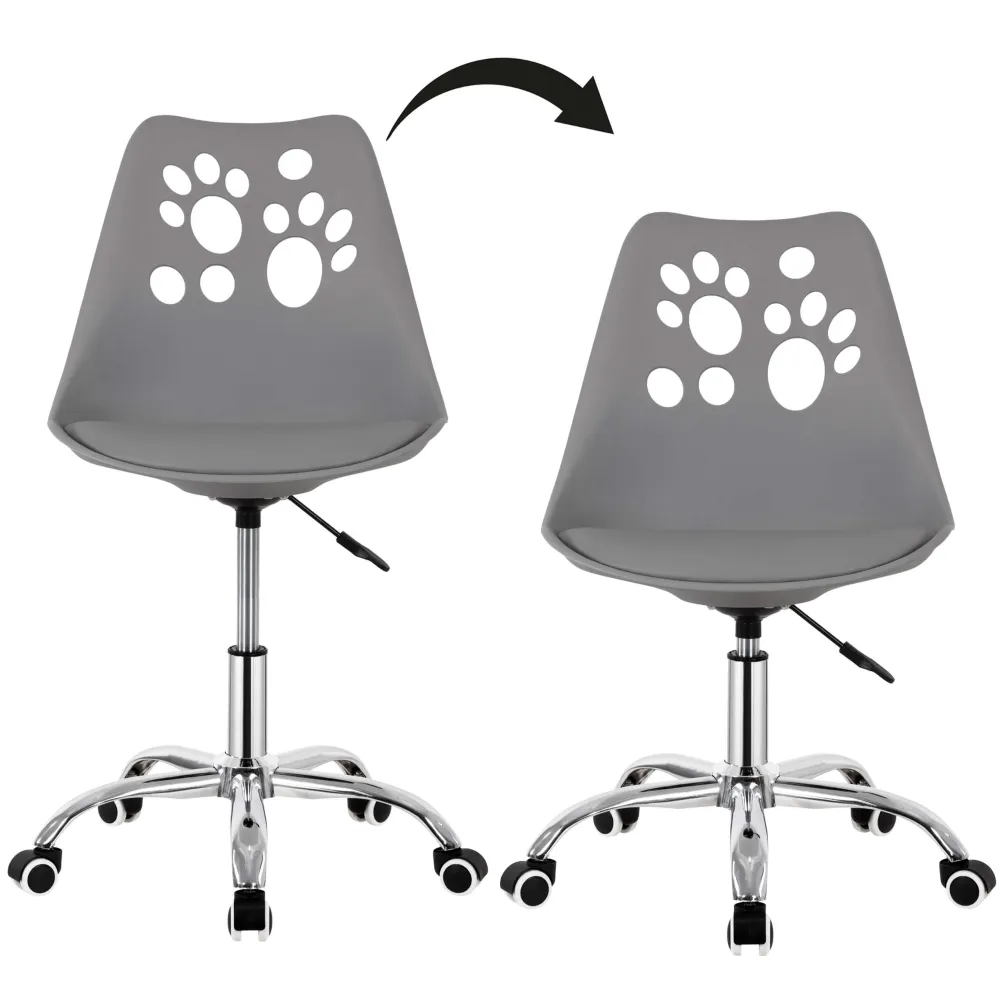 Štýlová otočná stolička k písaciemu stolu v šedej farbe. Ideálne do detskej, študentskej i tínedžerskej izby. Výškovo nastaviteľná, s hladkými kolieskami a ergonomickým tvarom pre zdravé sedenie. Mäkký polstrovaný sedák zaisťuje pohodlie pri učení aj hraní. Jemné pastelové tóny a operadlo s výrezmi v tvare labky dodajú izbe hravý vzhľad. Jednoduchá údržba a odolné spracovanie - ideálne k PC aj na domáce úlohy. Nosnosť 120 kg.