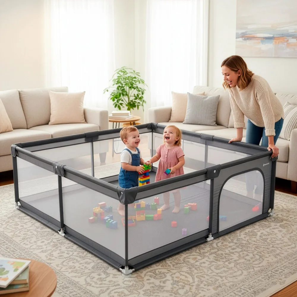 Priestranná detská ohrádka vytvára bezpečné miesto na hru aj odpočinok doma. Pevná kovová konštrukcia zaisťuje stabilitu, zatiaľ čo sieťované steny poskytujú dobrú viditeľnosť a cirkuláciu vzduchu. Praktický vstup so zipsom uľahčuje prístup, protišmykové prísavky pomáhajú udržať ohrádku na mieste a vrecko je ideálne na uloženie hračiek či drobností.