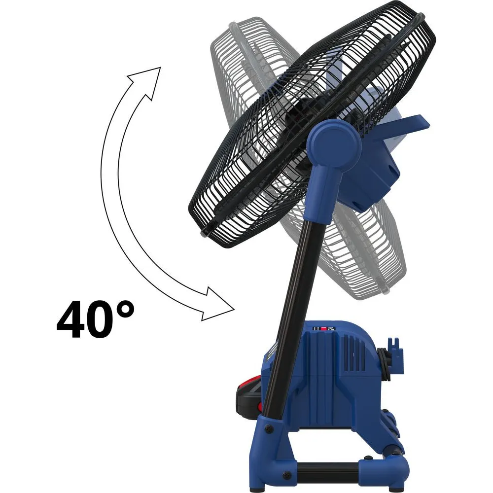 Akumulátorový ventilátor zo série akumulátorového náradia 18V E3 na použitie v domácnosti a dielni. Nastaviteľné trojrýchlostné prúdenie vzduchu, nastaviteľná doba prevádzky (nepretržitá prevádzka alebo časovač na 1, 2 alebo 4 hodiny). Maximálna rýchlosť prúdenia vzduchu 360 m/min. Ventilátor sklopný v rozsahu 40 °. Prevádzka je možná na akumulátor alebo so sieťovým adaptérom 230 V. Gumové nožičky. Vrátane akumulátora 2,0 Ah a nabíjačky.