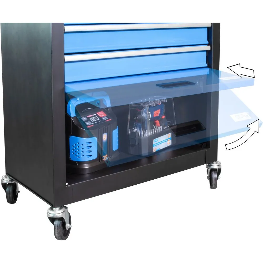 Malý a praktický dielenský vozík s podložkou na odkladacej ploche, ktorá zaisťuje väčšiu priľnavosť. Štyri zásuvky na guličkových ložiskách s blokovacím systémom ponúkajú dostatok miesta na náradie a veľká odkladacia priehradka s uzáverom je ideálnym úložným priestorom pre vyššie stroje. Štyri riadiace kolieska, dva kolieska s aretačnou brzdou. Dodáva sa bez vyobrazeného náradia.