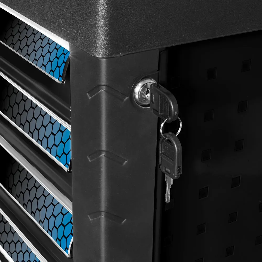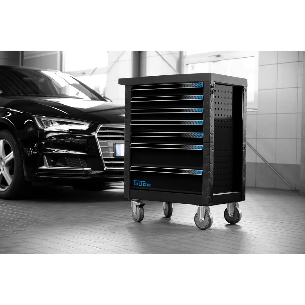 Pojazdný vozík s náradím do autodielne alebo garáže domáceho majstra. Pracovná plocha s integrovanými odkladacími priehradkami. Dvojstupňový systém uzamykania (centrálne uzamykanie s dvoma kľúčmi a samostatným uzamykaním zásuviek). Popisovateľné zásuvky s plným vysúvaním, uložené na guličkových ložiskách, s poistkou proti vytiahnutiu zásuviek. Normované dierovanie bočných stien umožňuje dodatočné možnosti rozšírenia na umiestnenie príslušenstva, ako napríklad dodatočných držiakov náradia, ochrana hrán, oceľový plech natretý práškovou farbou, pogumovaná rukoväť. Štyri veľké kolesá s ľahkým chodom (dve ovládateľné s brzdou).