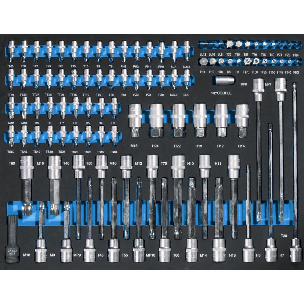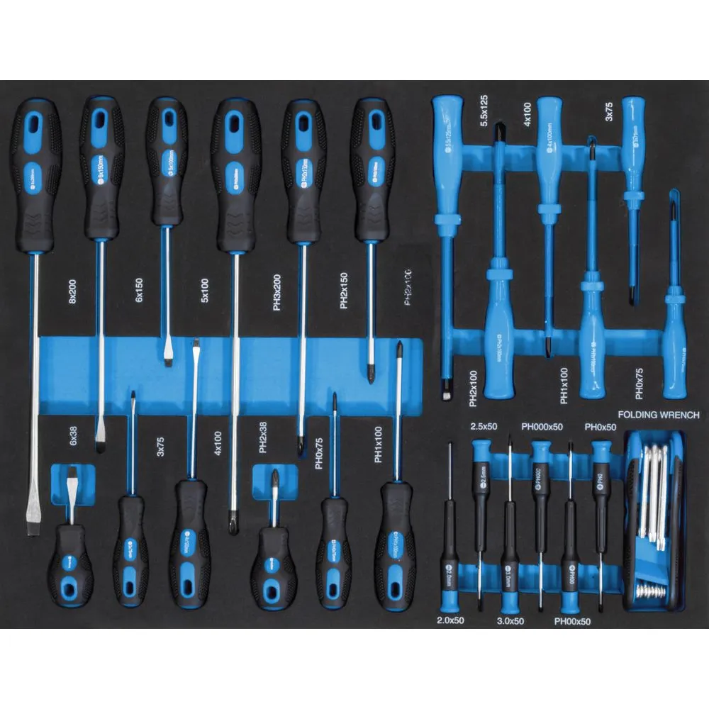 - 21 magnetických skrutkovačov s mäkkou rukoväťou: PHO/PH2x100, PH2x38, PH1x75, PH3x150, SL3/SL6x100, SL638, SL5x75, SL8x150, T6/T7/T8/T9/T10x75, T15/T20/T25/T27/T30x100, T40x150