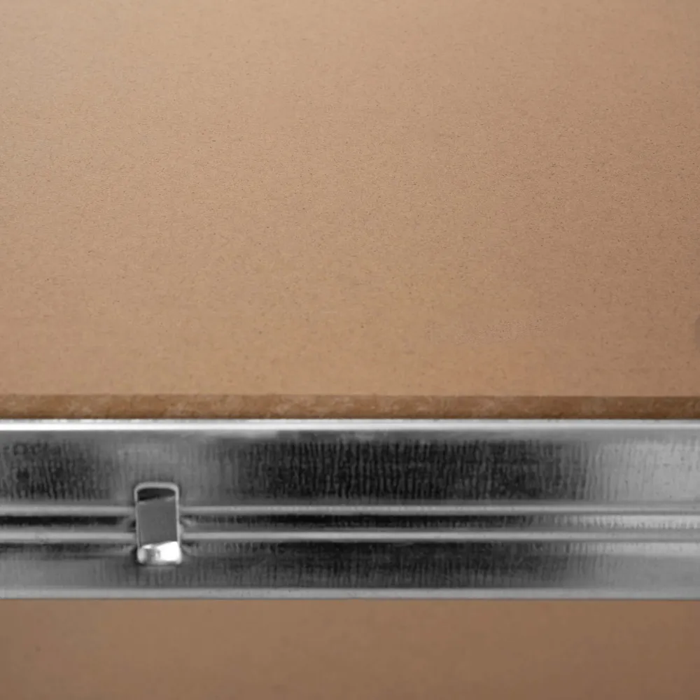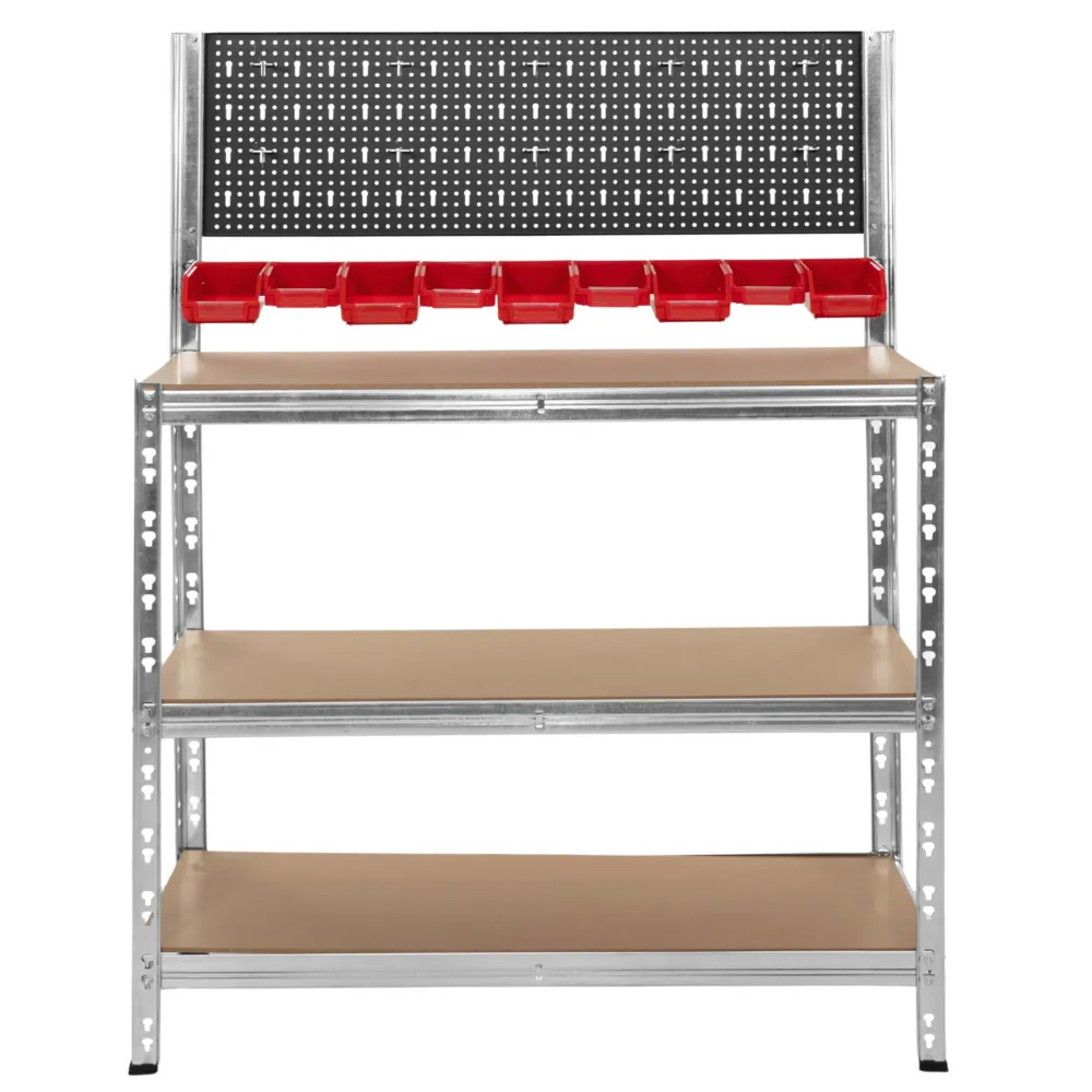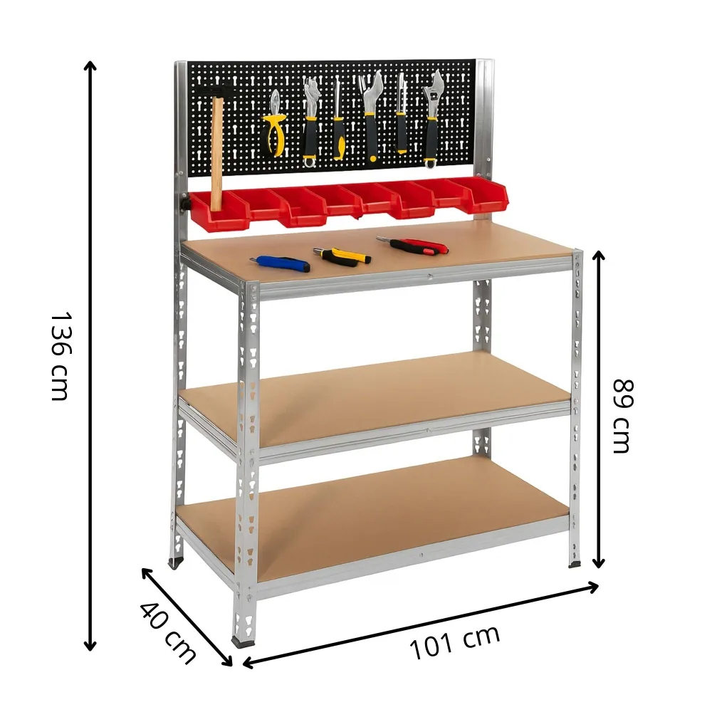 Dielenský stôl s perforovanou stenou a 10 háčikmi na prehľadné uloženie náradia. Súčasťou je 9 úložných boxov so štítkami pre skrutky a drobné súčiastky. Pracovná doska 98×38 cm s nosnosťou 200 kg ponúka dostatok priestoru na prácu. Pevná a stabilná konštrukcia doplnená o dve spodné police zaisťuje celkovú nosnosť 620 kg. Ideálne pre dielňu, garáž aj hobby použitie.