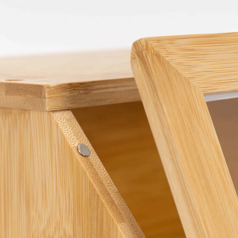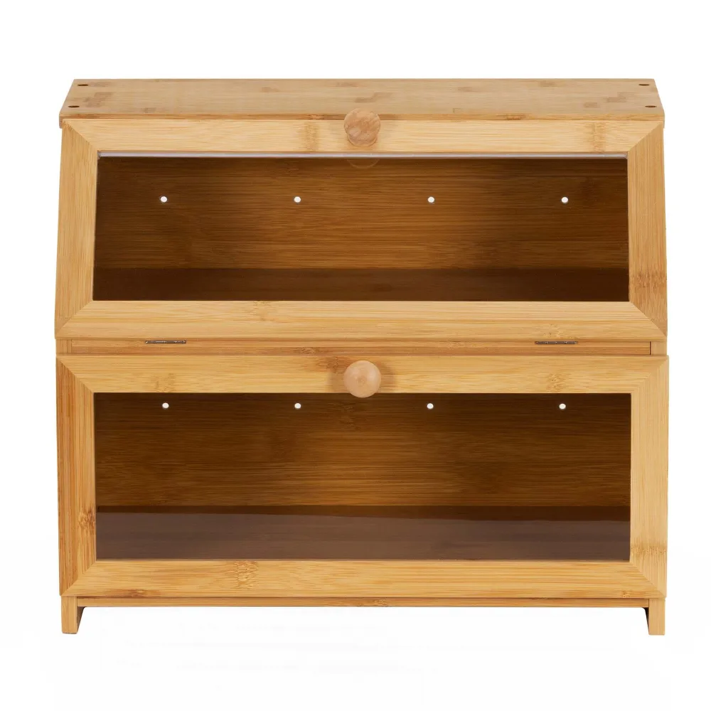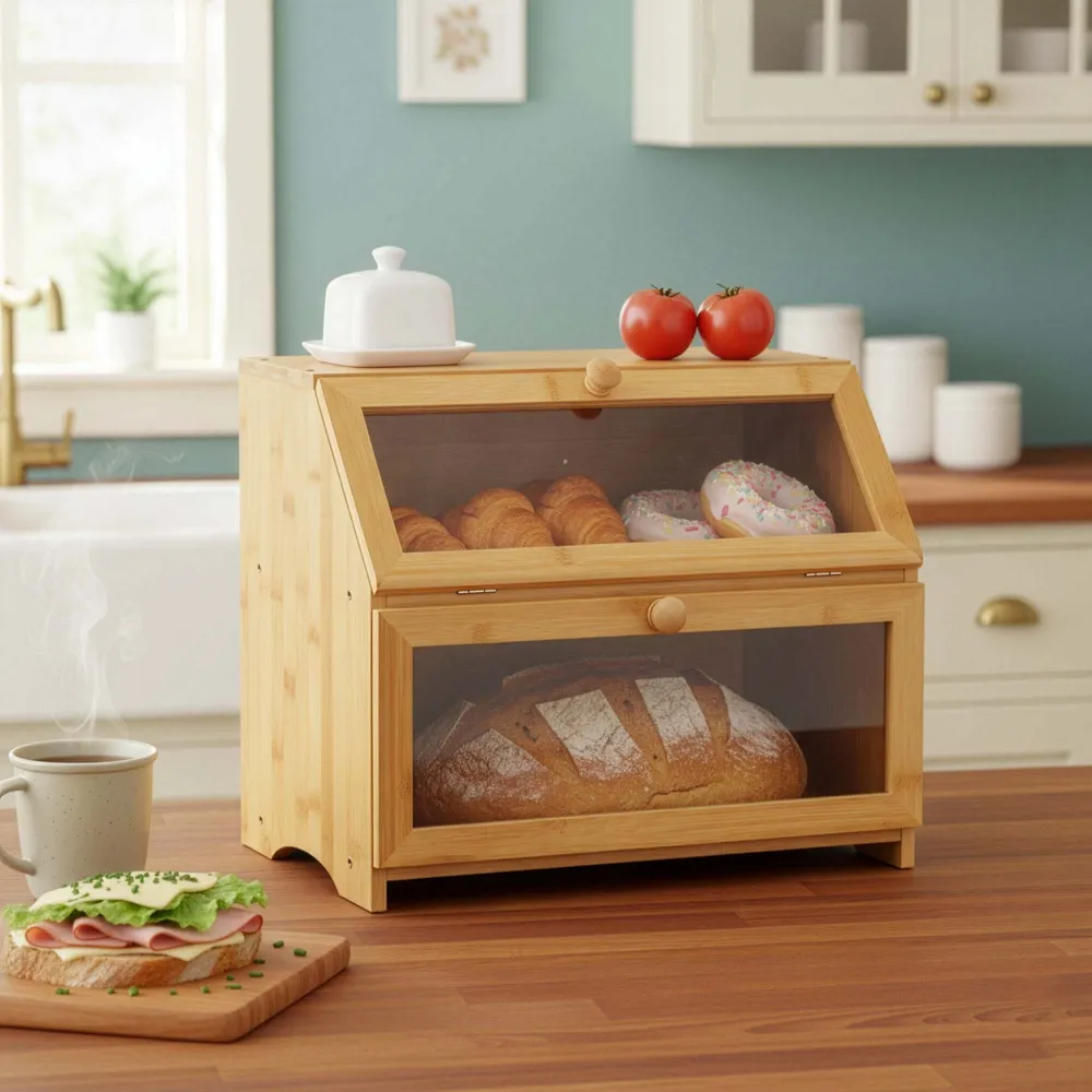 Praktický bambusový chlebník s dvoma poschodiami pomáha uchovať pečivo dlhšie čerstvé a prehľadne usporiadané. Priehľadné akrylové okienka umožňujú ľahkú kontrolu obsahu bez otvárania. Magnetické zatváranie zaisťuje pohodlné používanie, bočné úchyty uľahčujú prenášanie. Prírodný vzhľad z neho robí elegantný doplnok každej kuchyne.