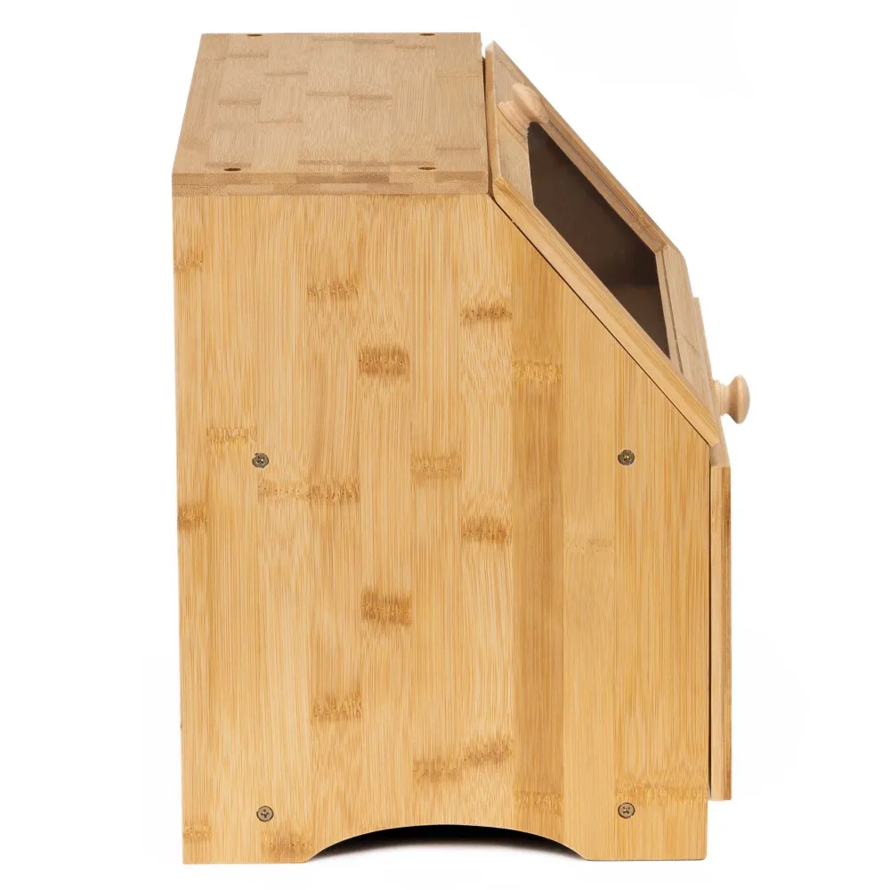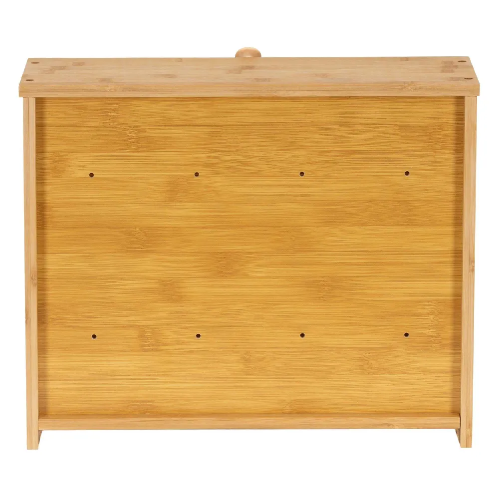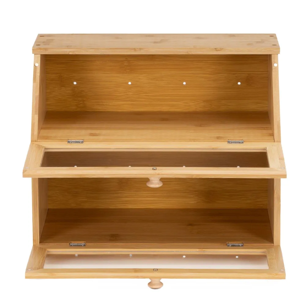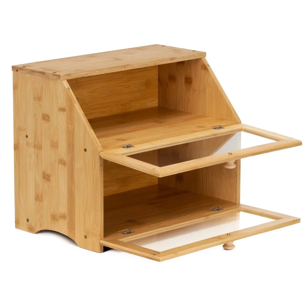 Praktický bambusový chlebník s dvoma poschodiami pomáha uchovať pečivo dlhšie čerstvé a prehľadne usporiadané. Priehľadné akrylové okienka umožňujú ľahkú kontrolu obsahu bez otvárania. Magnetické zatváranie zaisťuje pohodlné používanie, bočné úchyty uľahčujú prenášanie. Prírodný vzhľad z neho robí elegantný doplnok každej kuchyne.