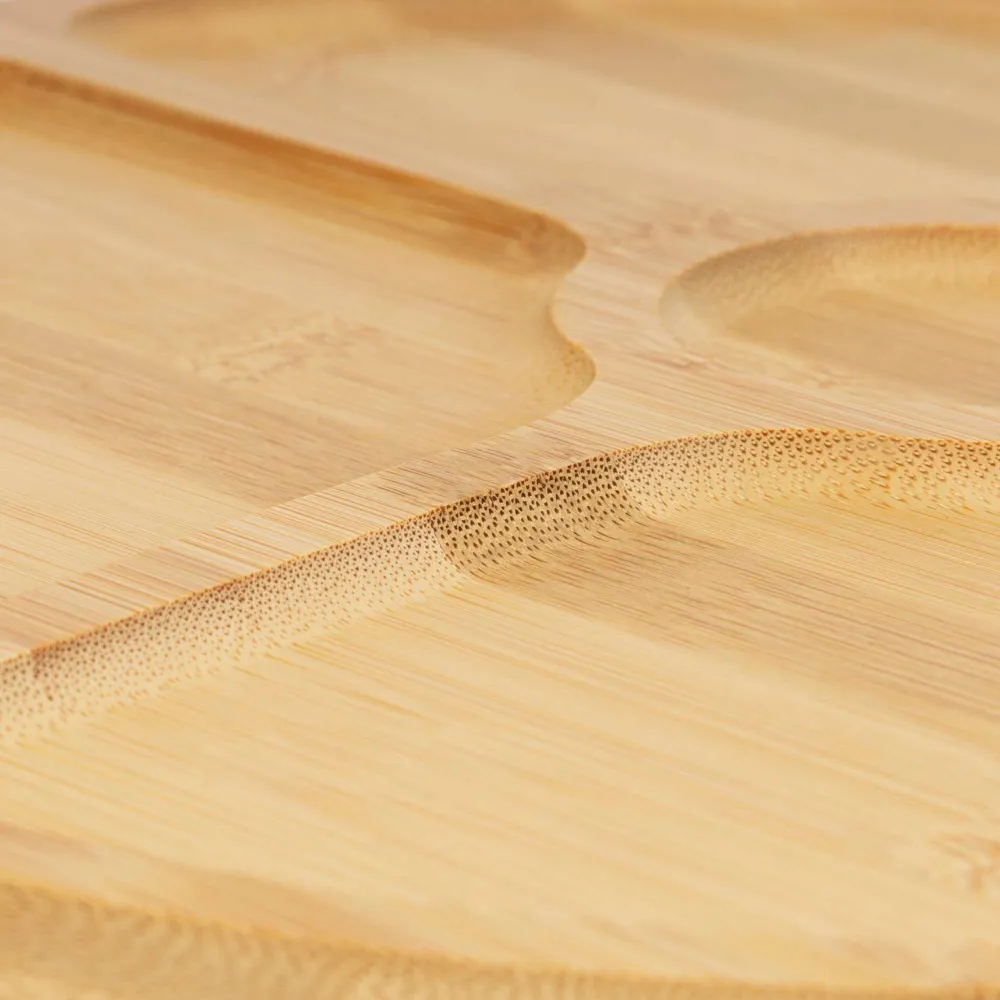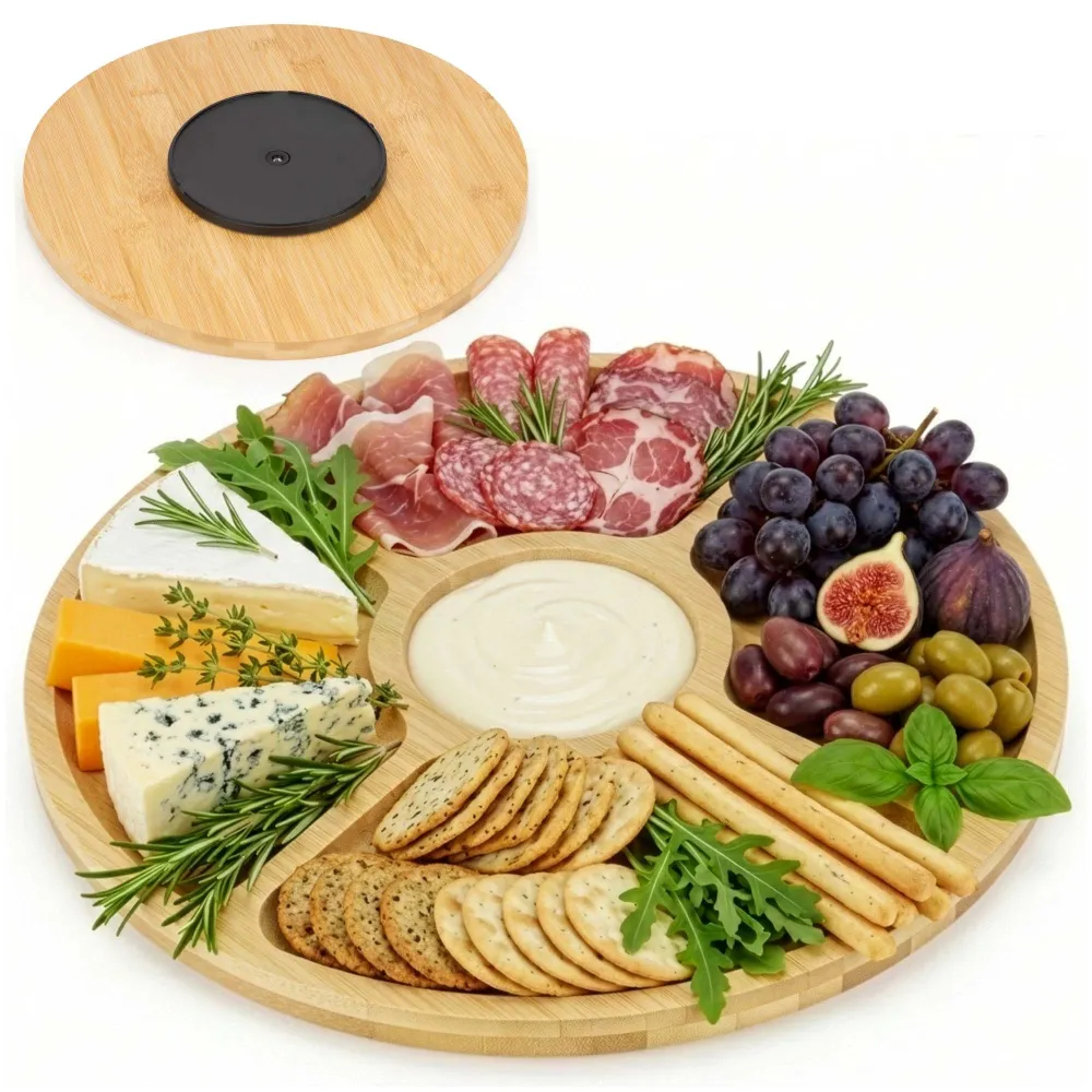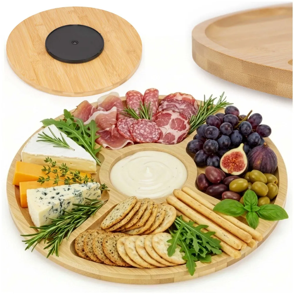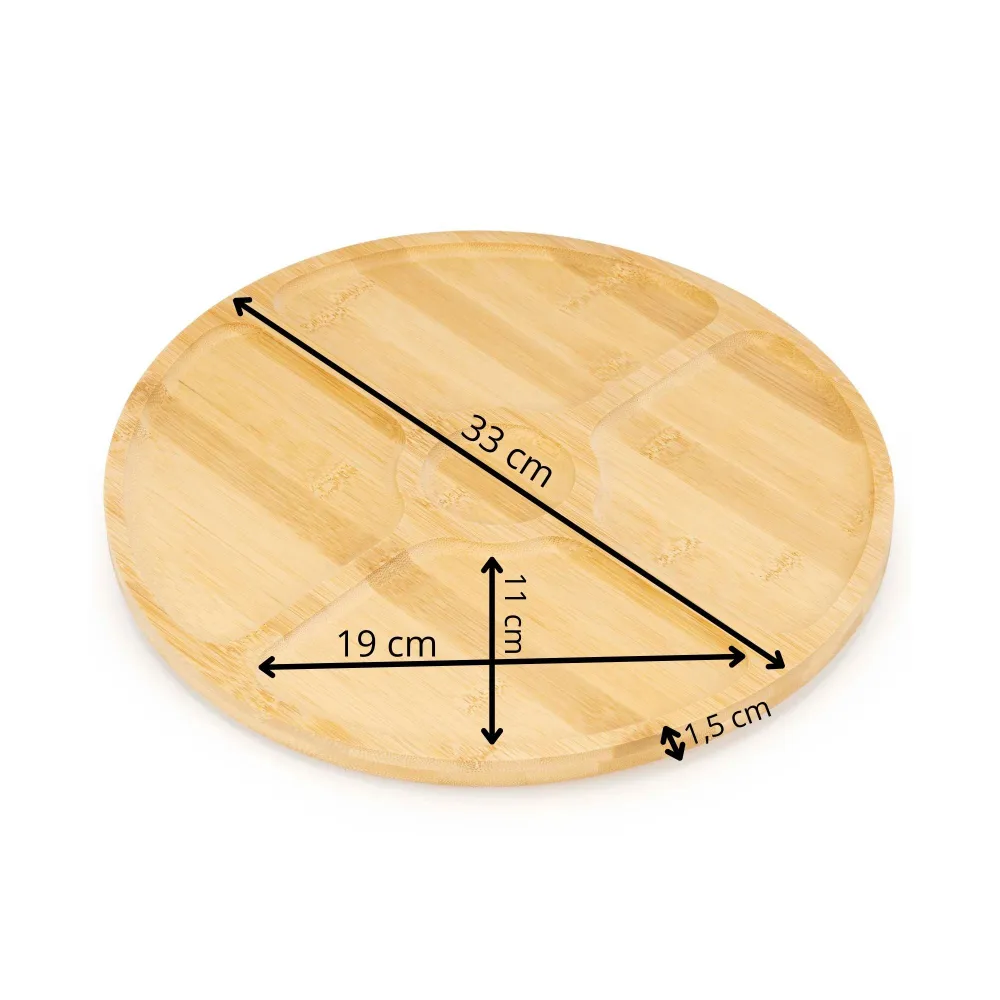 Tanier na servírovanie je vyrobený z bambusového materiálu s prírodným vzhľadom , ktorý pôsobí elegantne a nadčasovo. Je schválený pre styk s potravinami , čo zaručuje bezpečné používanie pri servírovaní syrov, údenín, ovocia i dezertov. Tento otočný tanier je praktickým aj dizajnovým prvkom, ktorý spríjemní každé stolovanie.