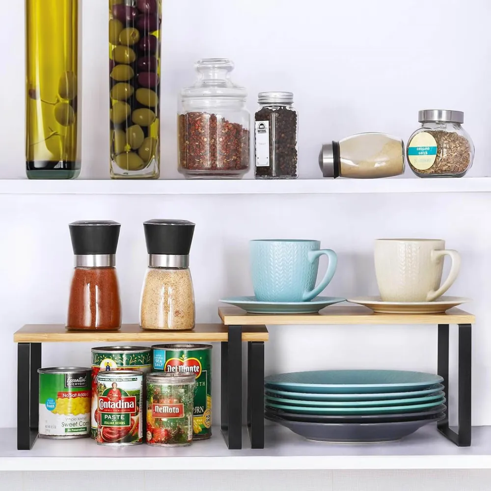 Sada dvoch kuchynských poličiek z bambusu a čierneho kovu prináša praktické riešenie na usporiadanie koreničiek a ďalších potrieb. Odolná a stabilná konštrukcia zaisťuje dlhú životnosť, zatiaľ čo univerzálny dizajn sa hodí do každej kuchyne. Prídavná polica na kuchynskú linku alebo stôl pomáha efektívne využiť priestor. Tento organizér je nielen funkčný, ale aj ekologický a esteticky atraktívny. Usporiadanie políc je možné prispôsobiť individuálnym potrebám.