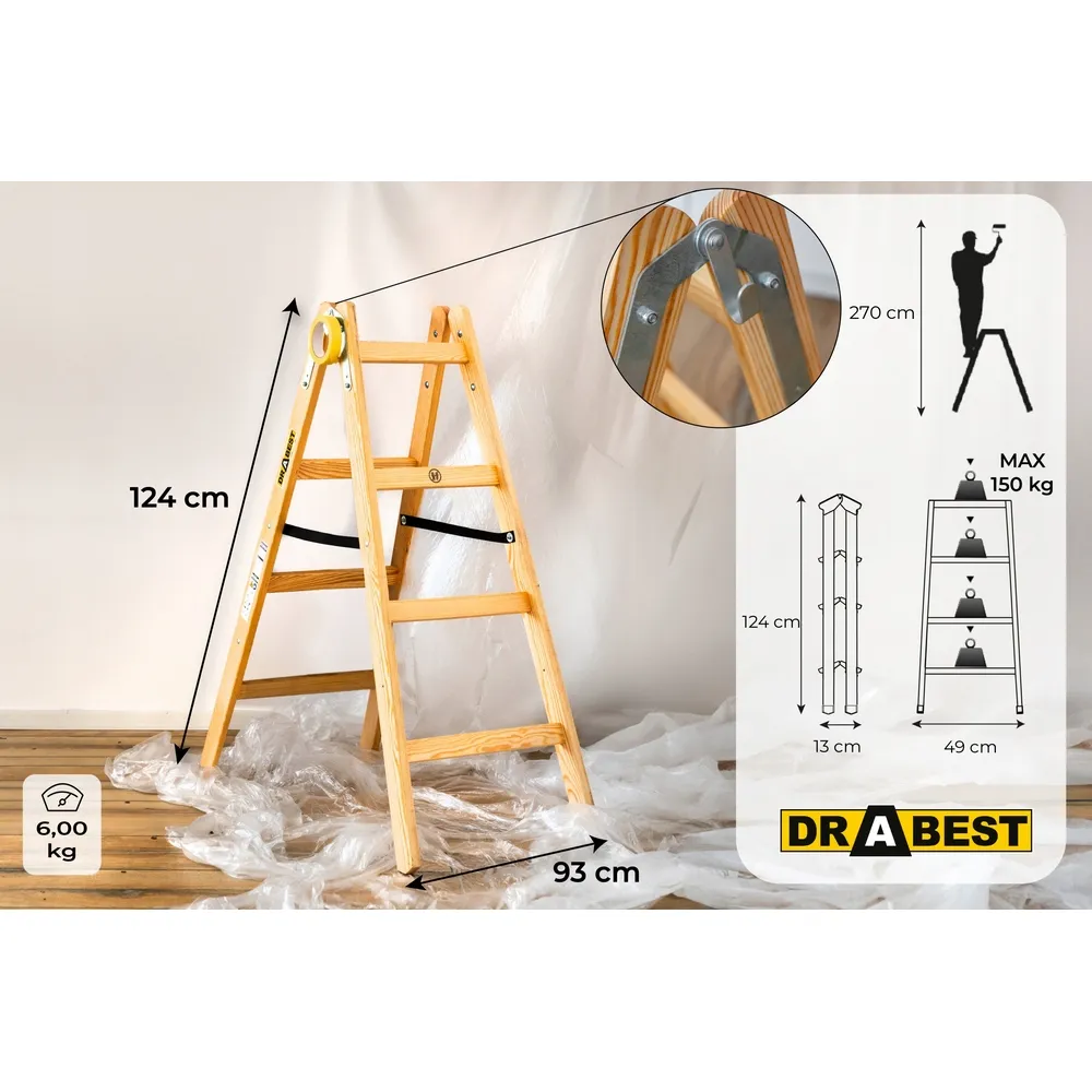 Drevené maliarske štafle 2x4 stupňa obojstranné DRABEST DREW 2x4 PRO sú ideálnou voľbou pre profesionálne aj domáce použitie. Sú vyrobené z vysoko kvalitného impregnovaného dreva bez hrčí , ktoré je odolné voči vlhkosti , čo zaisťuje dlhú životnosť aj pri pravidelnom používaní. Vďaka obojstrannému prevedeniu môžete bezpečne pracovať z oboch strán, čo zvyšuje flexibilitu pri práci.