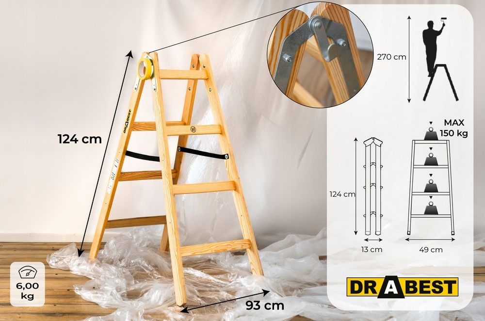 Drevené maliarske štafle 2x4 stupňa obojstranné DRABEST DREW 2x4 PRO sú ideálnou voľbou pre profesionálne aj domáce použitie. Sú vyrobené z vysoko kvalitného impregnovaného dreva bez hrčí , ktoré je odolné voči vlhkosti , čo zaisťuje dlhú životnosť aj pri pravidelnom používaní. Vďaka obojstrannému prevedeniu môžete bezpečne pracovať z oboch strán, čo zvyšuje flexibilitu pri práci.