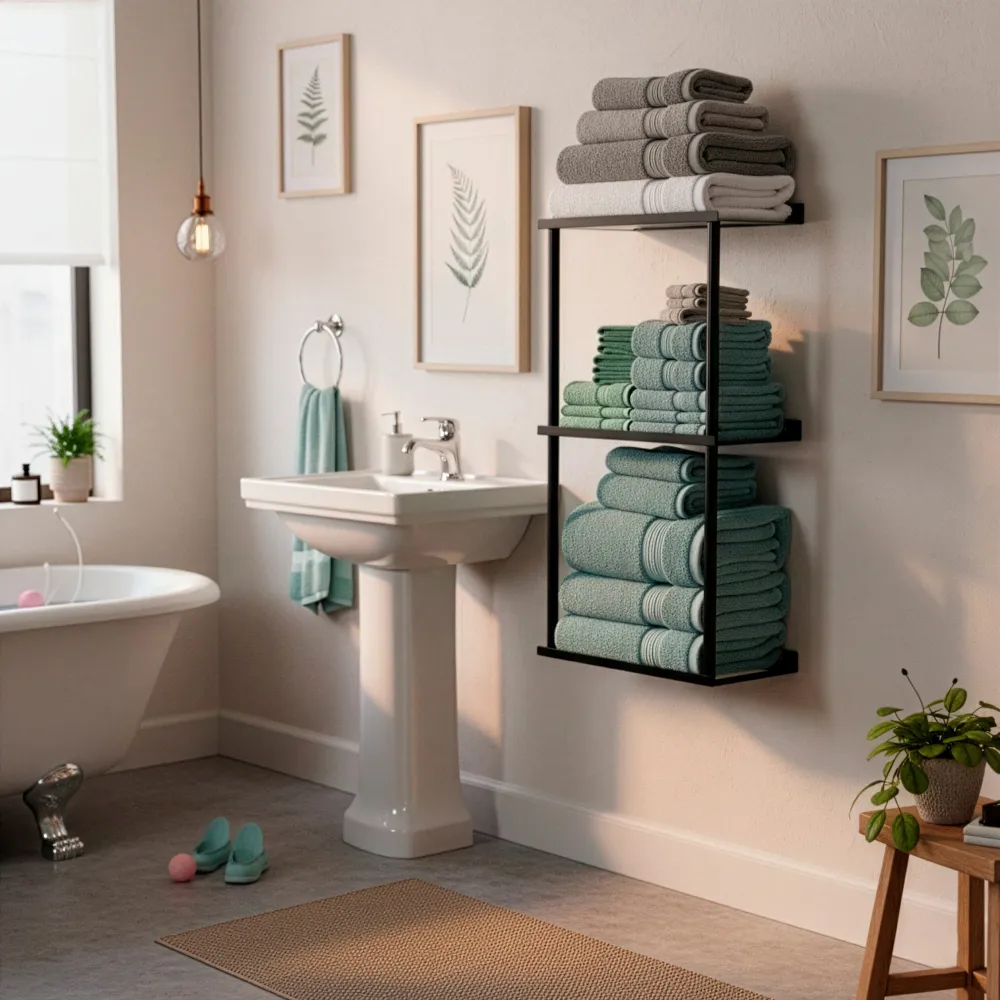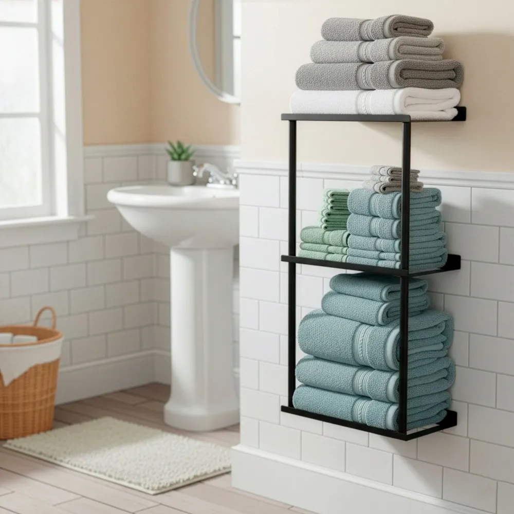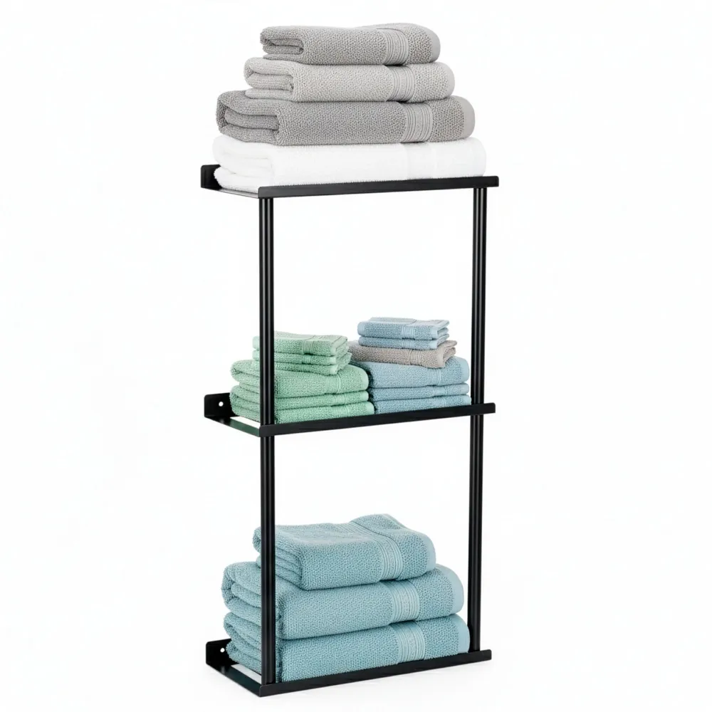 Praktický nástenný držiak v čiernom prevedení ponúka prehľadné a úsporné riešenie na uloženie uterákov v kúpeľni. Viac úrovní poskytuje dostatok priestoru na zložené textílie a pomáha udržať poriadok aj v menších miestnostiach. Pevná kovová konštrukcia zaisťuje stabilitu pri každodennom používaní a jednoduchý dizajn sa ľahko zladí s moderným aj minimalistickým interiérom.