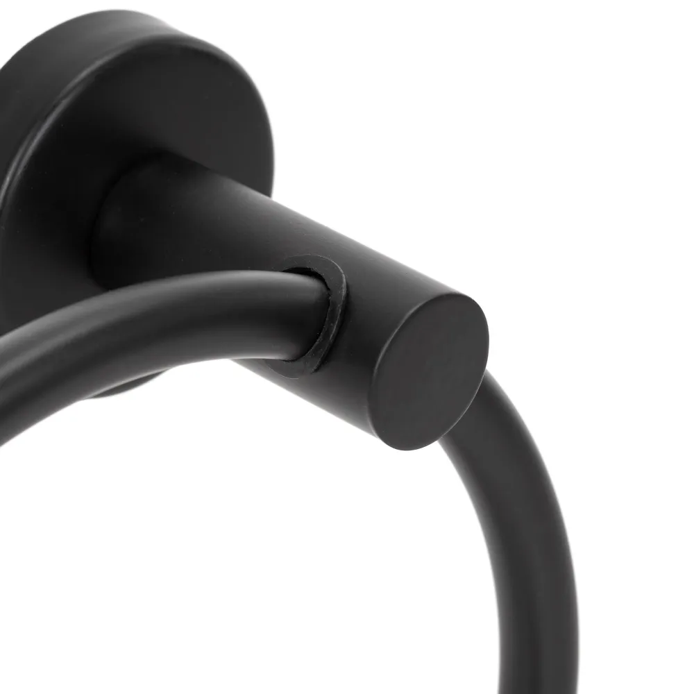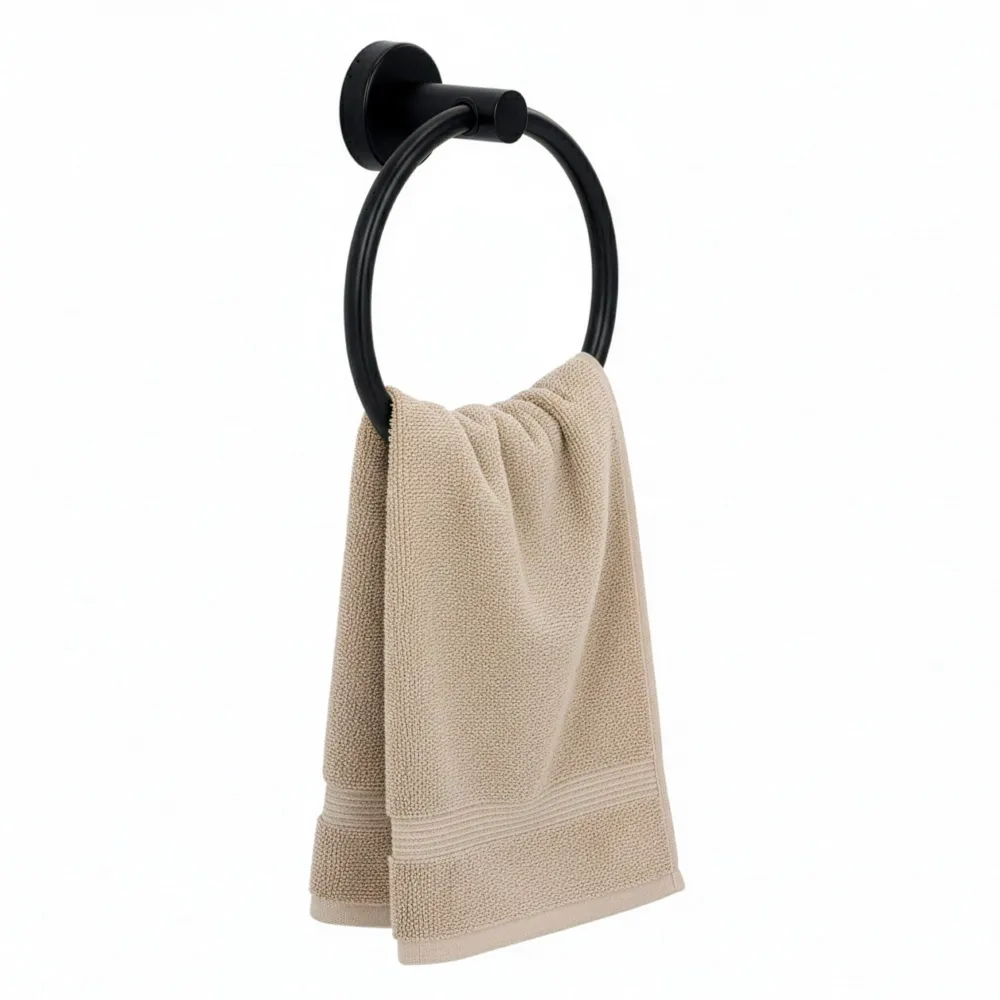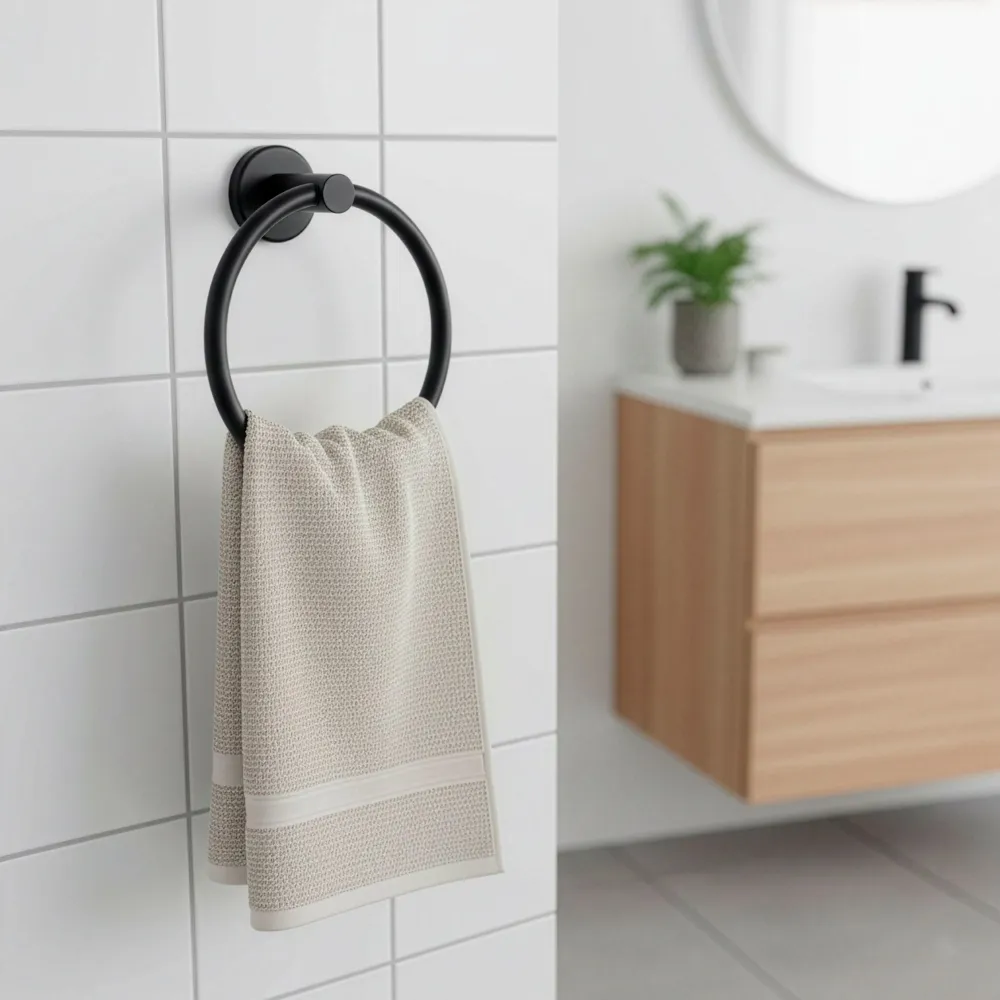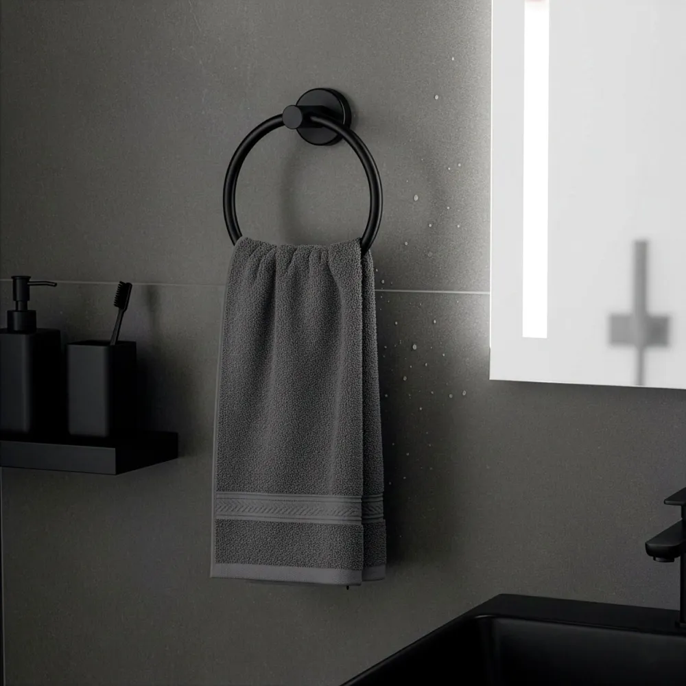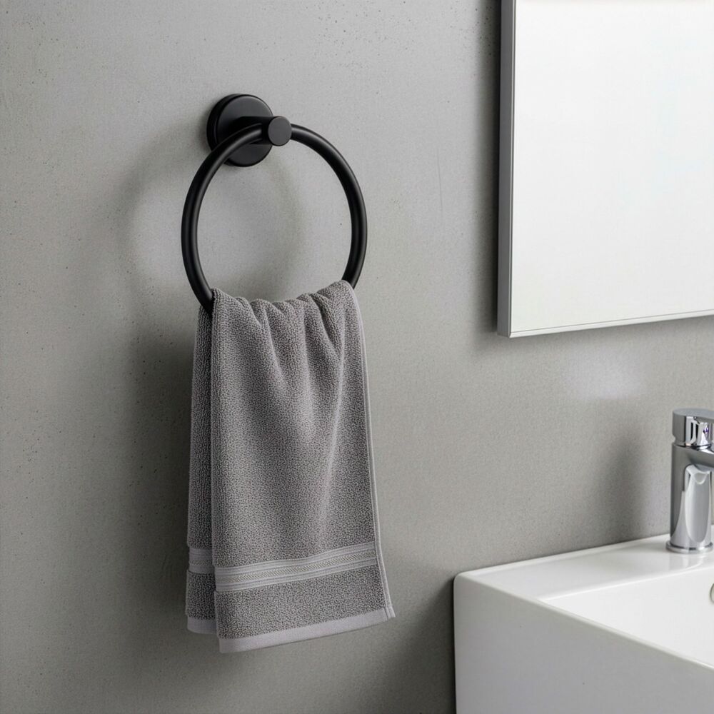 Elegantný kruhový držiak na uterák v matnom čiernom prevedení je praktickým doplnkom do každej kúpeľne. Ponúka pohodlné zavesenie uterákov a pomáha udržať priestor prehľadný a organizovaný. Pevné kovové prevedenie zaisťuje stabilitu pri každodennom používaní, zatiaľ čo nadčasový dizajn sa ľahko zladí s moderným aj klasickým interiérom. Montáž je jednoduchá vďaka priloženému príslušenstvu.