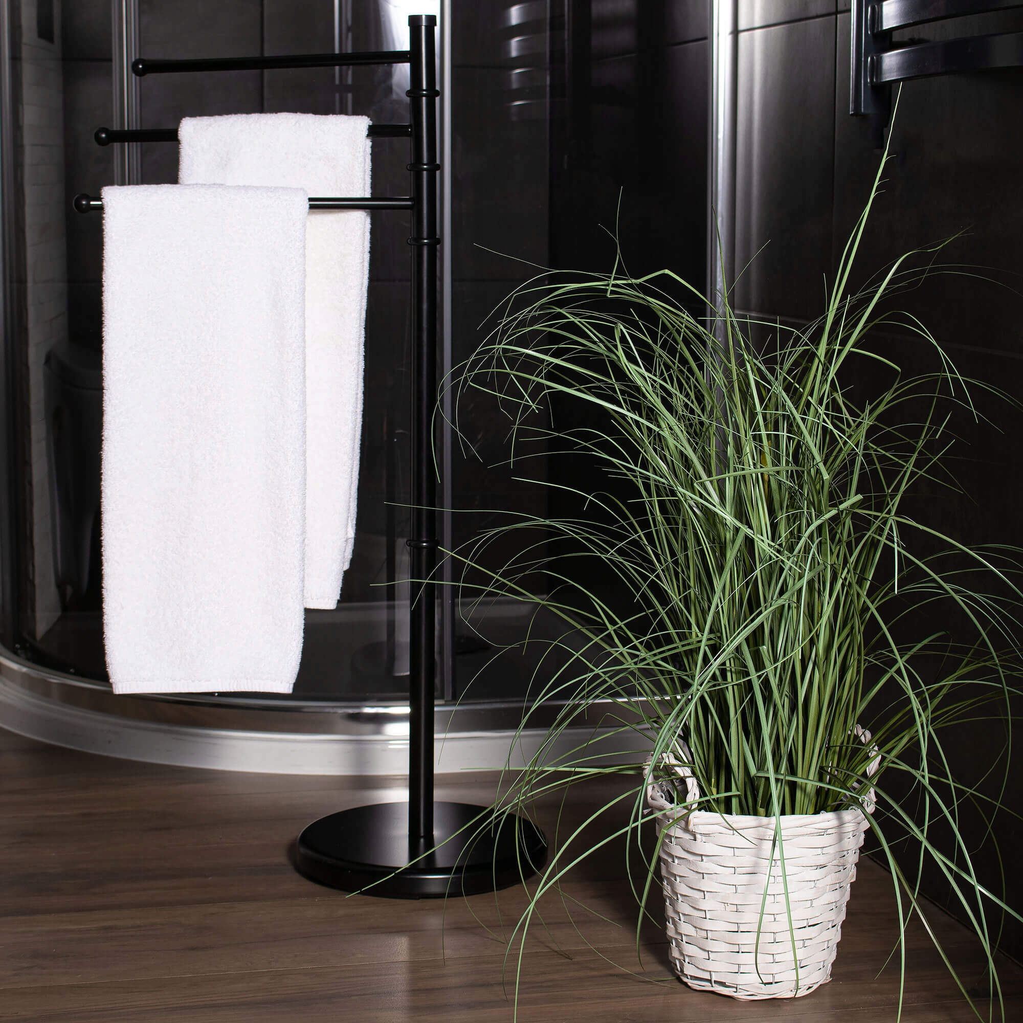 Trojramenný stojací vešiak na uteráky do kúpeľne je funkčným doplnkom interiéru. Extrémne jednoduchý a pritom veľmi dobre vyzerajúci výrobok sa skvele hodí ako miesto na sušenie vlhkých uterákov, ako sušiak na bielizeň alebo na zavesenie kúpacích doplnkov.