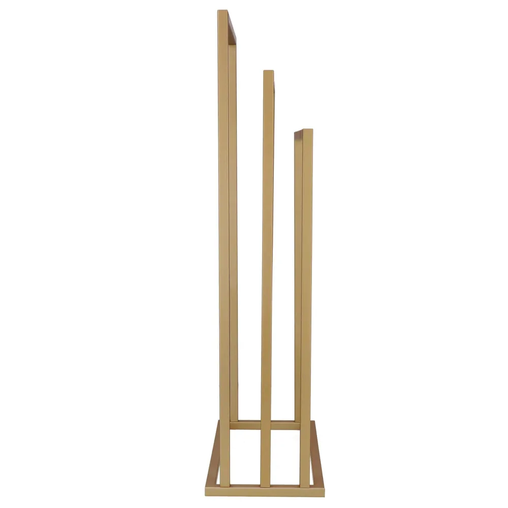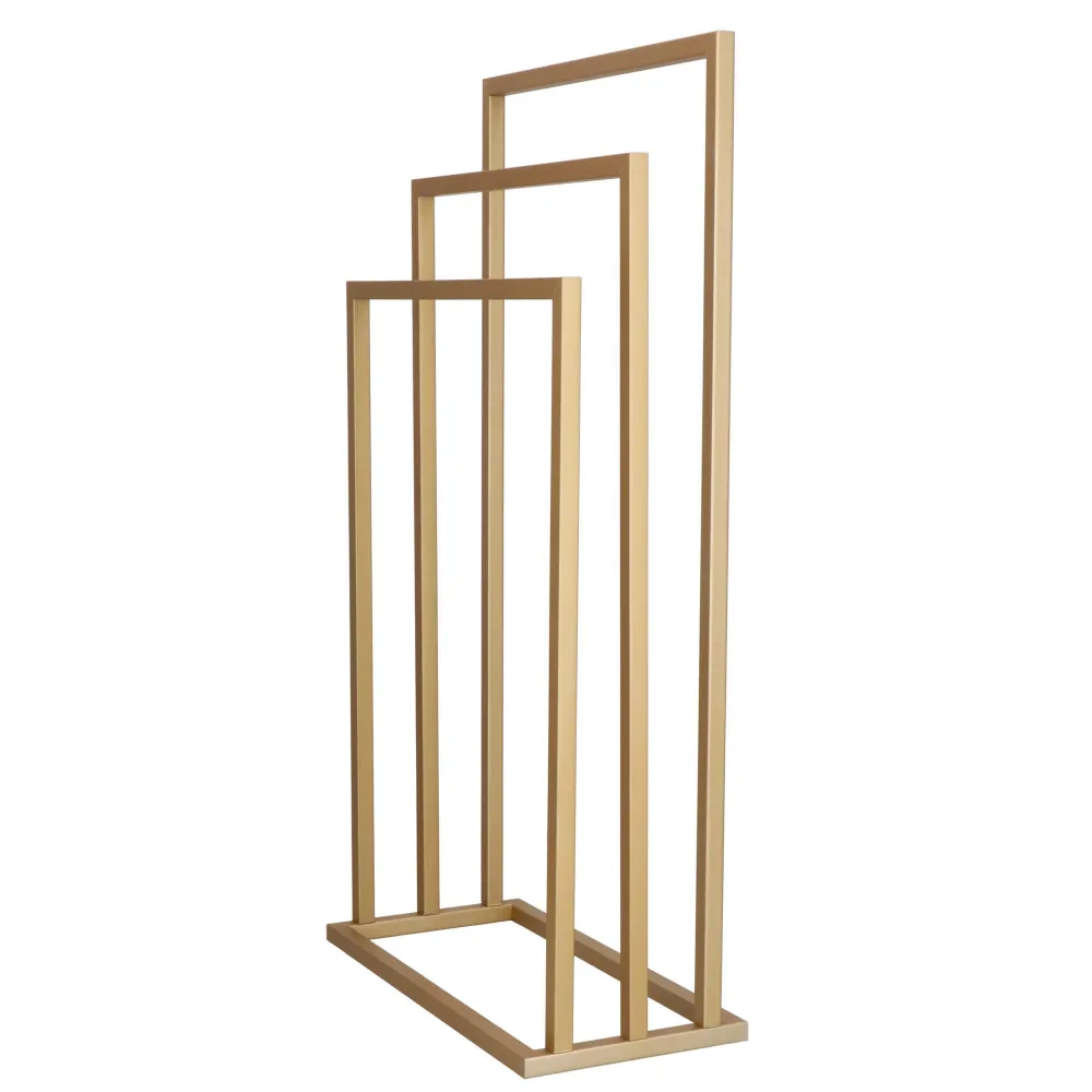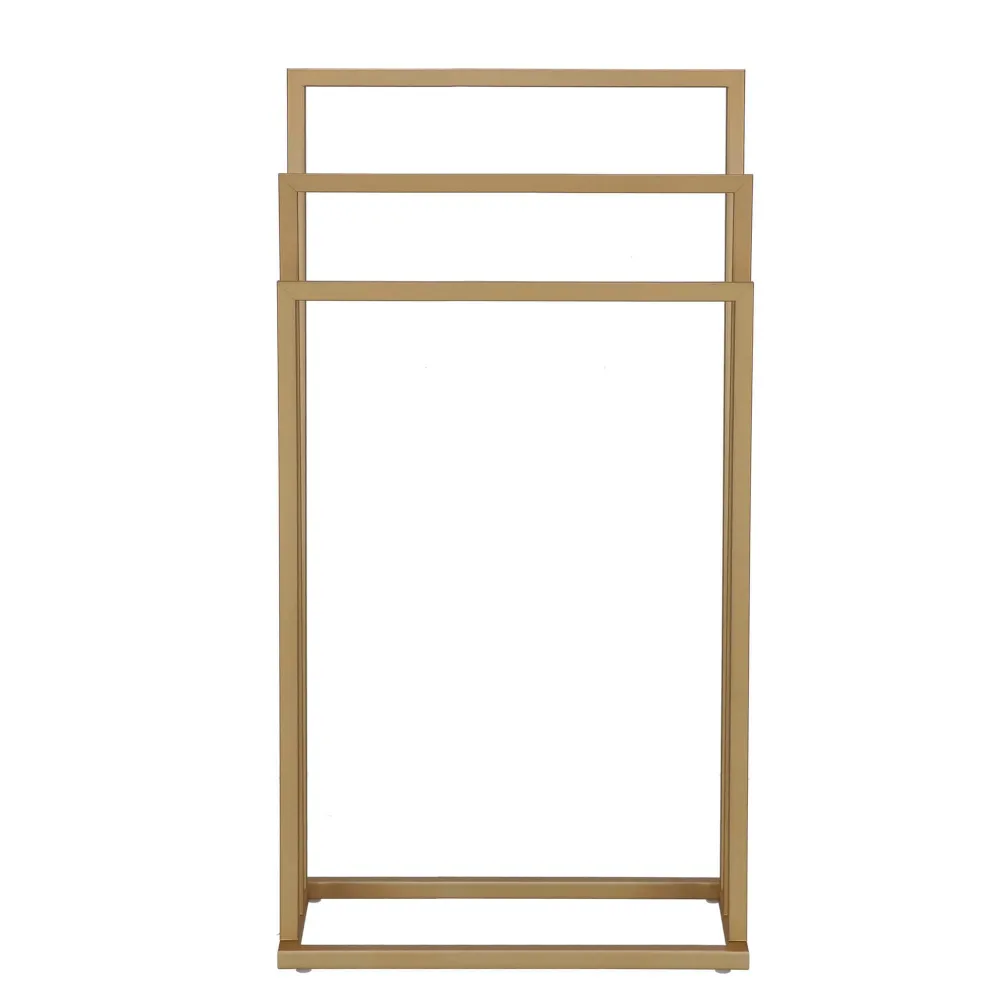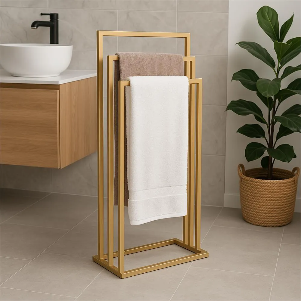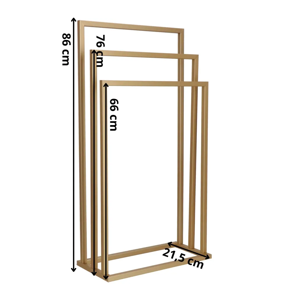 Elegantný stojan na uteráky s tromi ramenami na pohodlné zavesenie a sušenie vlhkých uterákov. Stabilná základňa so štyrmi protišmykovými podložkami zaisťuje bezpečné použitie. Široký kovový rám v zlatej farbe pôsobí štýlovo v každej kúpeľni. Praktický vešiak na uteráky slúži aj ako sušiak na bielizeň alebo držiak na kúpeľňové doplnky. Funkčný doplnok interiéru na každodenné použitie.