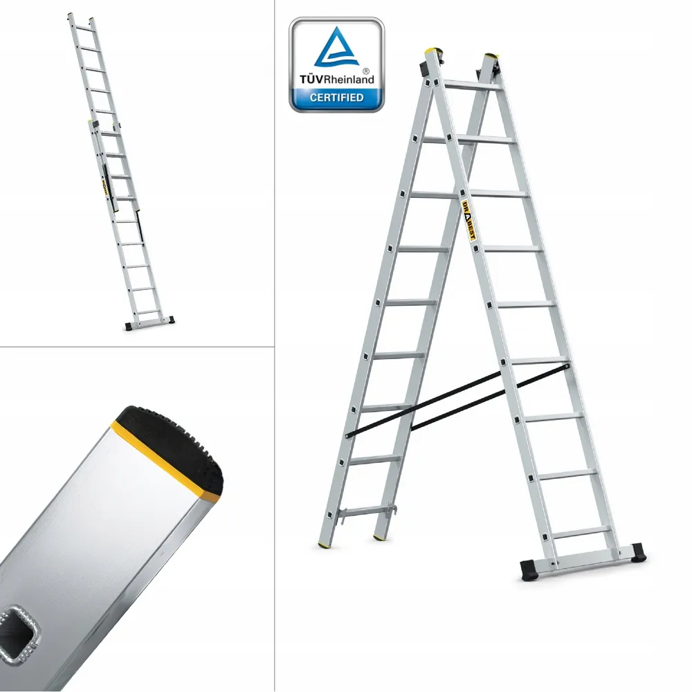 Hliníkový rebrík DRABEST DW2-9 PRO je vhodný na každodenné intenzívne používanie v priemysle, na stavbe a ďalších náročných odboroch vyžadujúcich nekompromisnú kvalitu. Rebrík spĺňa prísne bezpečnostné normy podľa EN 131 a je certifikovaný nemeckou skúšobňou TÜV Rheinland.