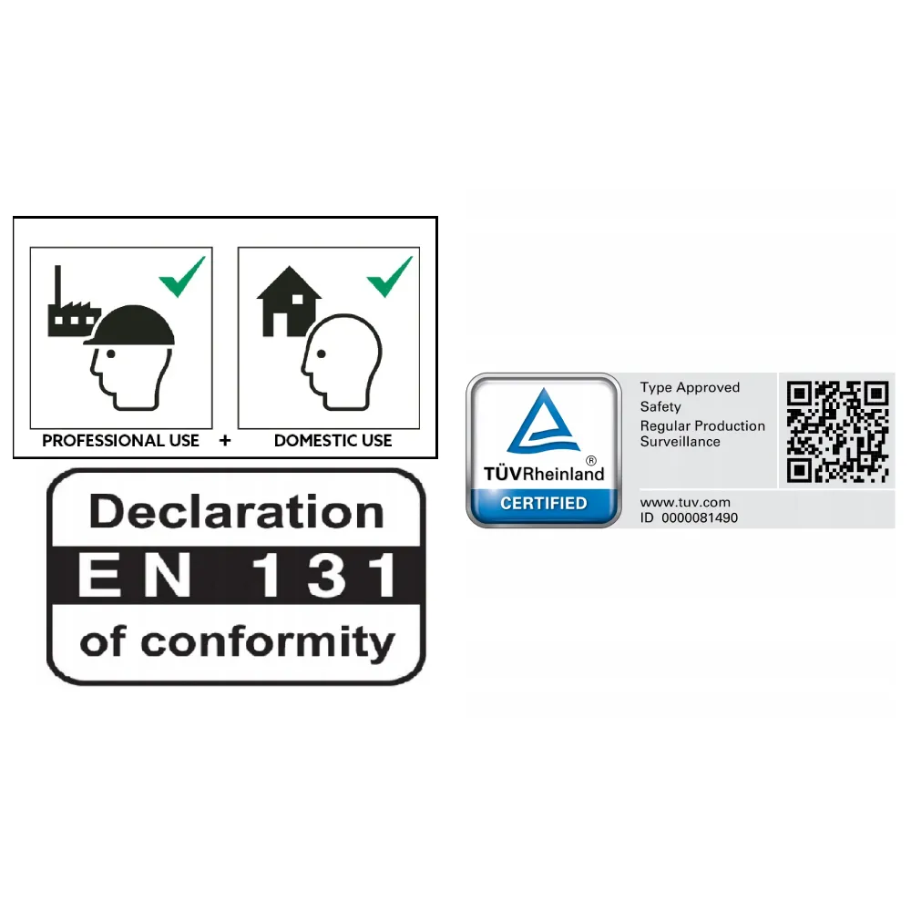 - Certifikácia TÜV Rheinland, EN 131 na profesionálne použitie
