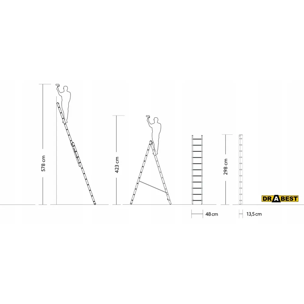 Profesionálny viacúčelový rebrík so stabilizátorom, 2x11 priečok, dĺžka rebríka 4,58 m, max. pracovná výška 5,78 m, nosnosť 150 kg. Certifikácia TÜV Rheinland, EN 131 pre profi použitie.
