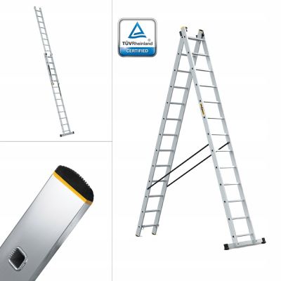 Profesionálny viacúčelový rebrík so stabilizátorom, 2x13 priečok, dĺžka rebríka 5,64 m, max. pracovná výška 6,55 m, nosnosť 150 kg. Certifikácia TÜV Rheinland, EN 131 pre profi použitie.