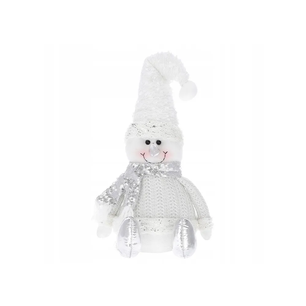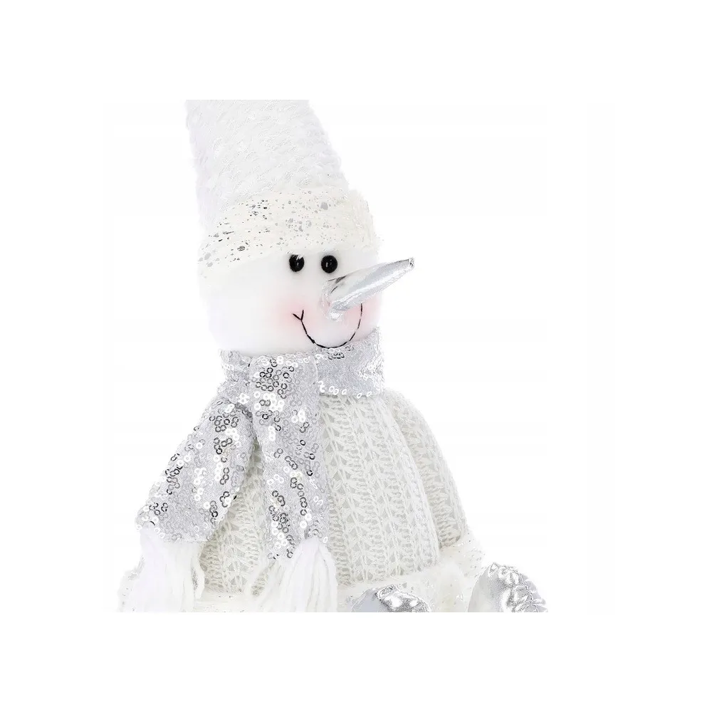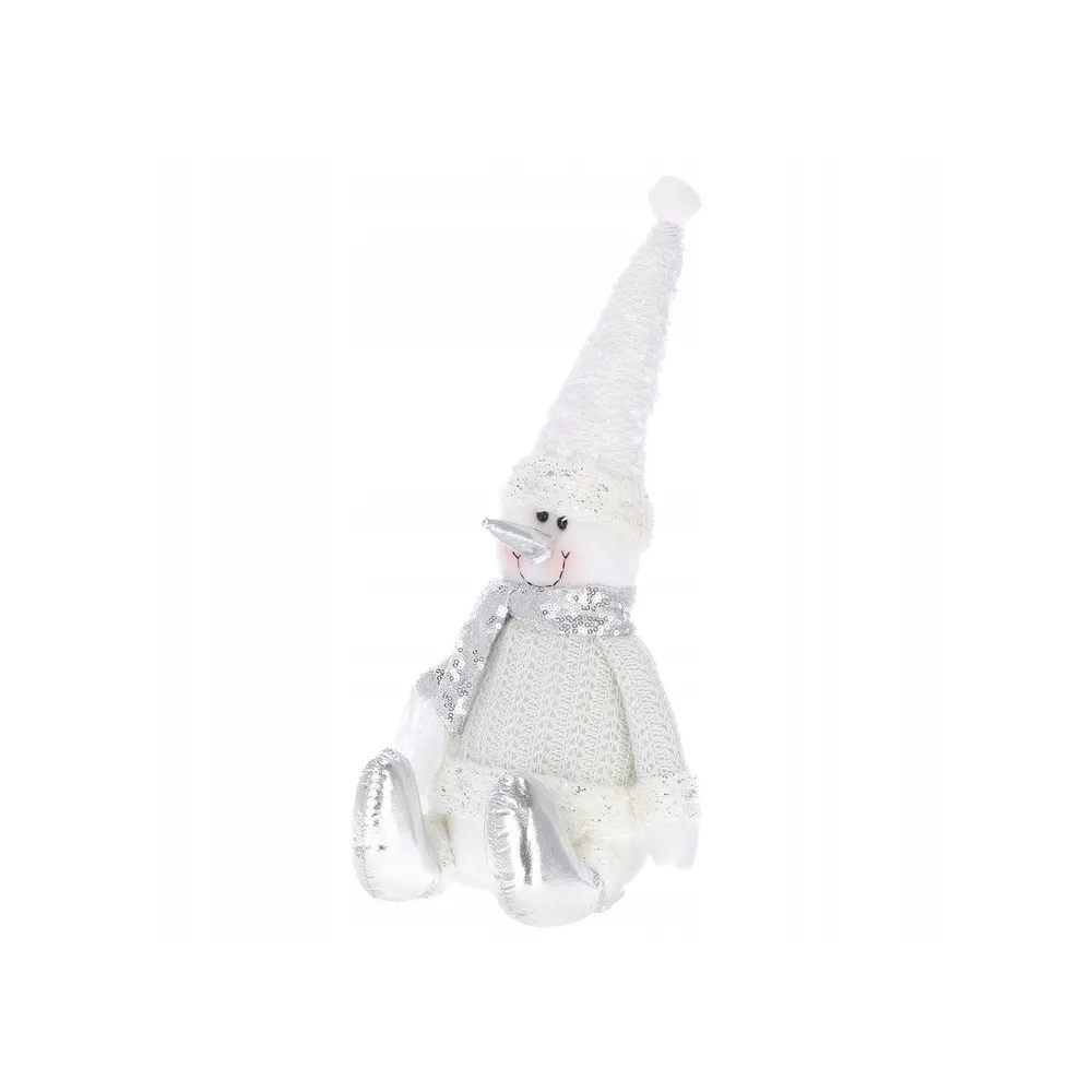 Plyšová dekorácia usmievavého snehuliaka o výške 43cm. Sediaca pozícia, pletený obleček, strieborné prvky, stabilná základňa, kvalitné na dotyk príjemný materiál. Prekrásna vianočná dekorácia, ktorá sa stane ozdobou každého interiéru.
