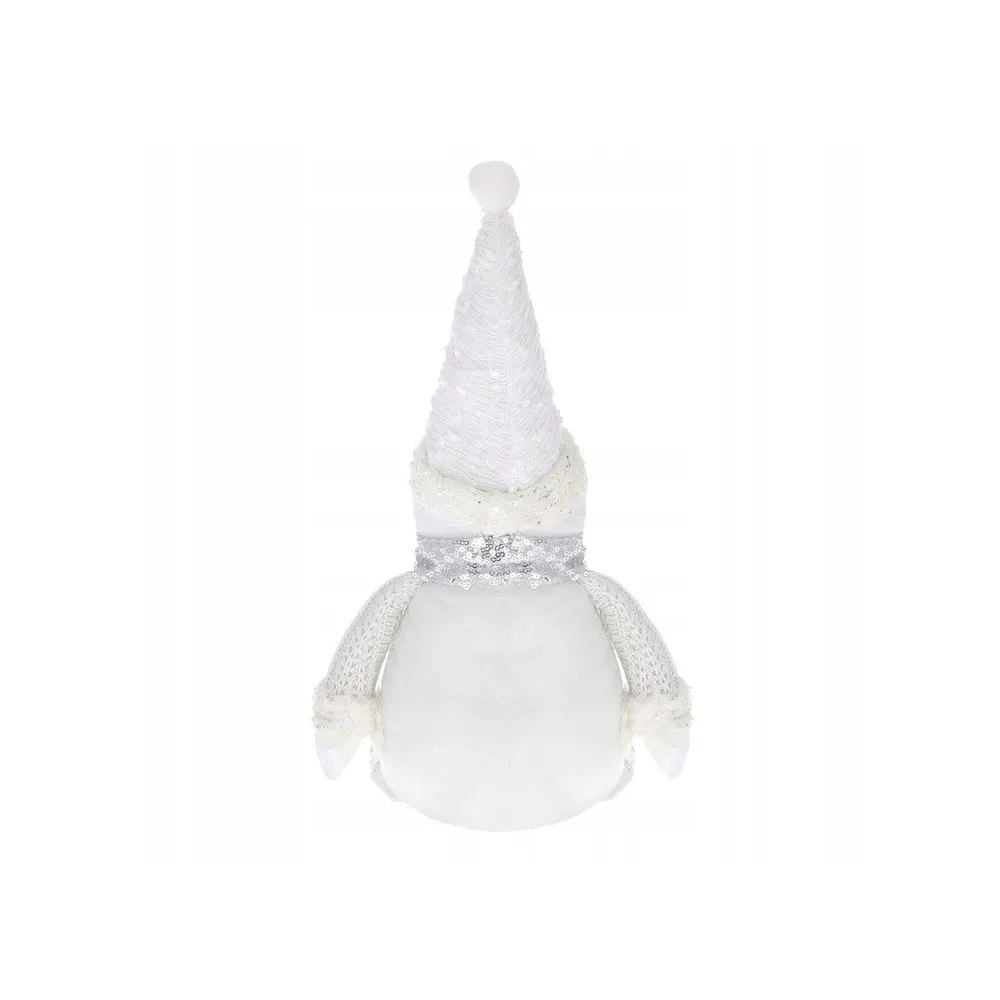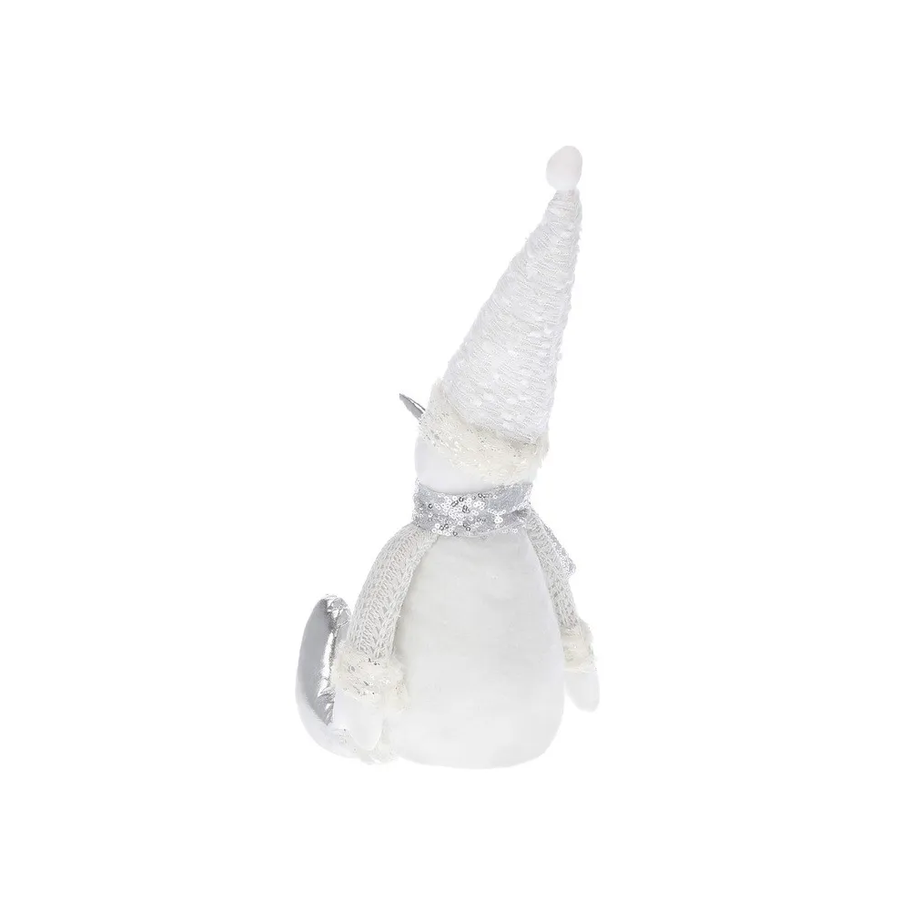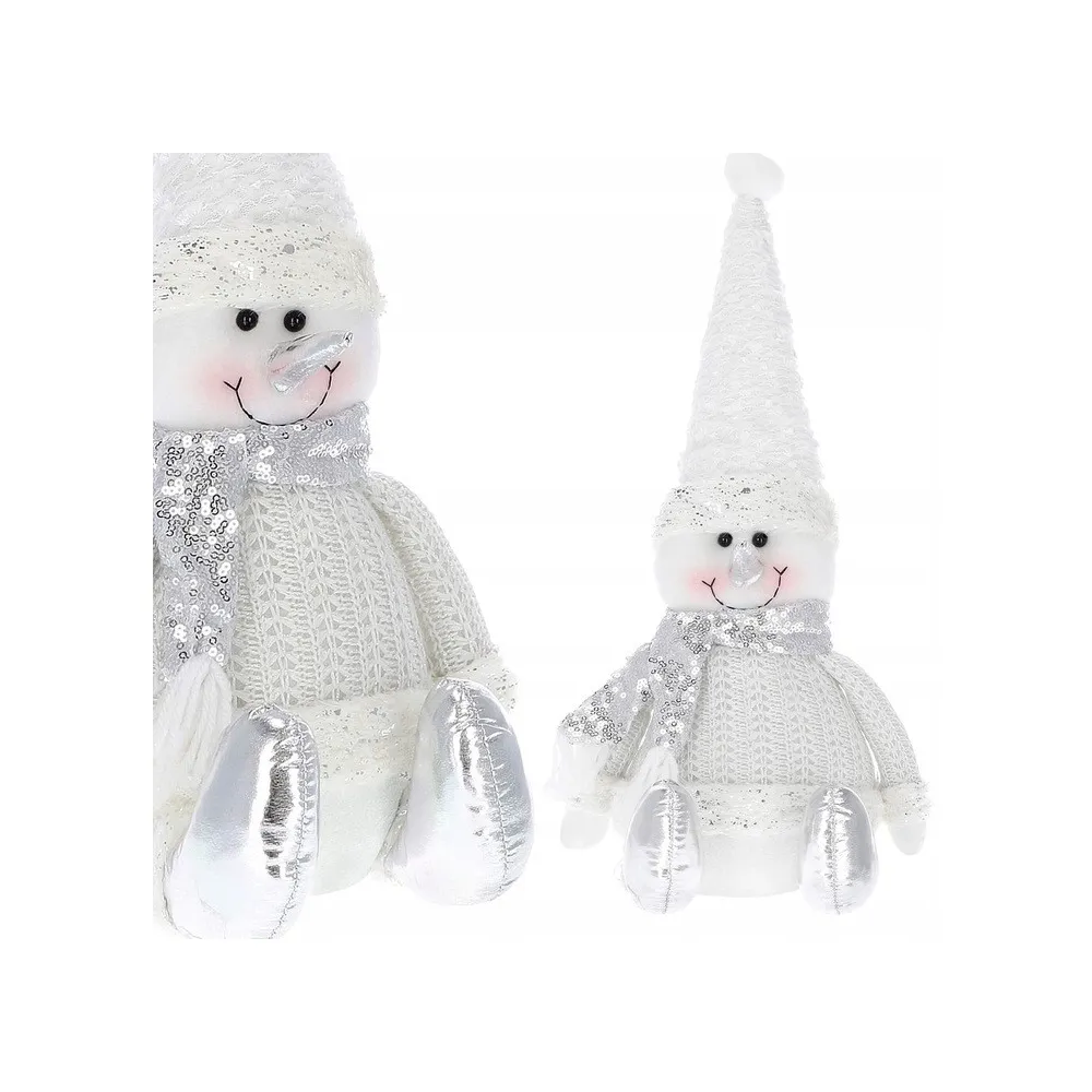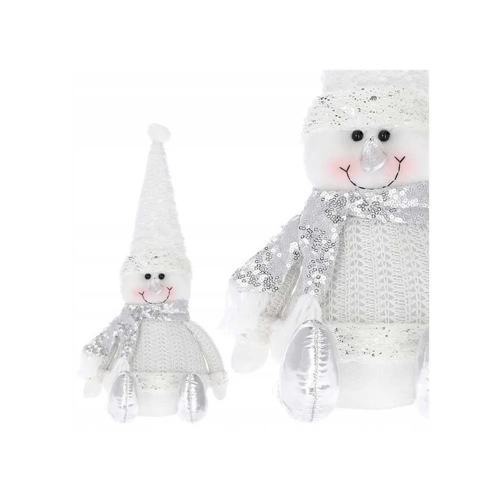Plyšová dekorácia usmievavého snehuliaka o výške 43cm. Sediaca pozícia, pletený obleček, strieborné prvky, stabilná základňa, kvalitné na dotyk príjemný materiál. Prekrásna vianočná dekorácia, ktorá sa stane ozdobou každého interiéru.