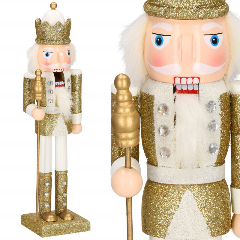 Drevená dekorácia kráľa so žezlom. Výška 38 cm, stojaca pozícia, stabilná základňa, detailná ručná maľba so zirkónmi, pohyblivé ústa. Prekrásna vianočná dekorácia, ktorá sa stane ozdobou každého interiéru.