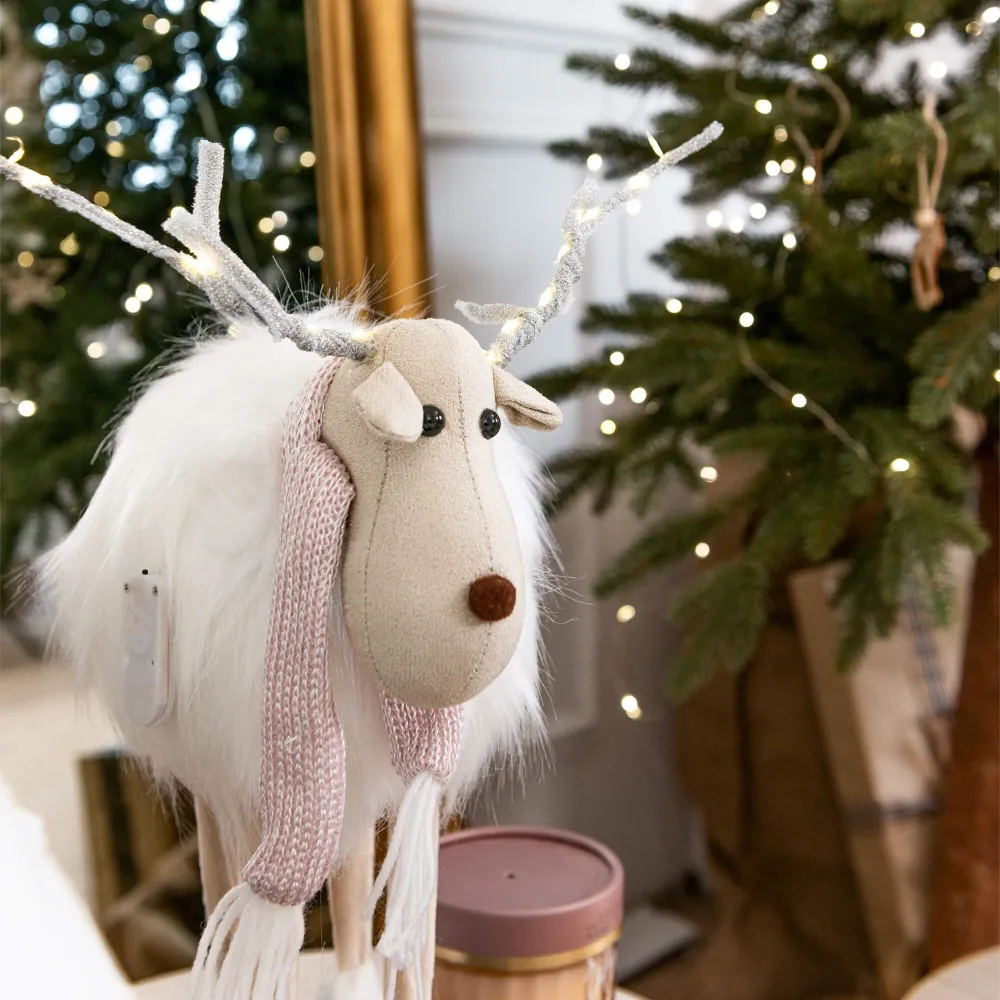 Plyšová dekorácia vianočného soba so svietiacim parožím . Stojaca pozícia, stabilná základňa so spojenými topánkami, parohy s LED osvetlením, chlpaté telo, kvalitné a na dotyk príjemný materiál. Prekrásna vianočná dekorácia, ktorá sa stane ozdobou každého interiéru.