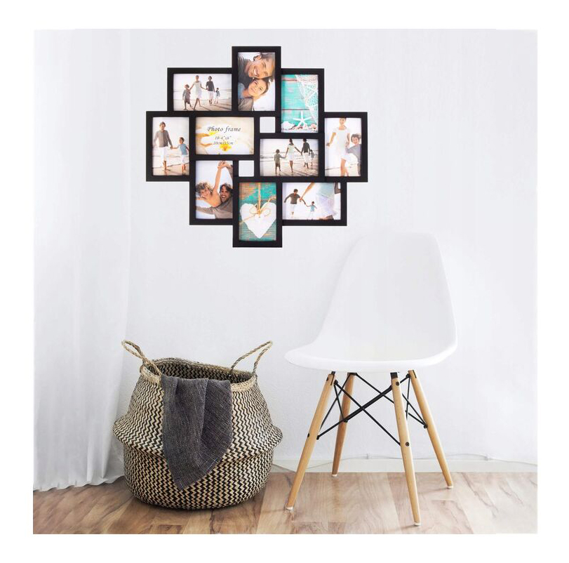 Nástenný rámček pre 10 fotografií vo formáte 10x15 cm. Vodorovné aj zvislé uchytenie na stenu, ľahká výmena fotografií. Veľmi ľahké, napriek tomu odolné prevedenie, pútavý vzhľad. Celkové rozmery 53x49 cm.