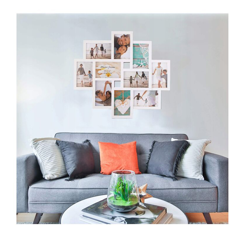Nástenný rámček pre 10 fotografií vo formáte 10x15 cm . Vodorovné aj zvislé uchytenie na stenu, ľahká výmena fotografií. Veľmi ľahké, napriek tomu odolné prevedenie, pútavý vzhľad. Celkové rozmery 53x49 cm.