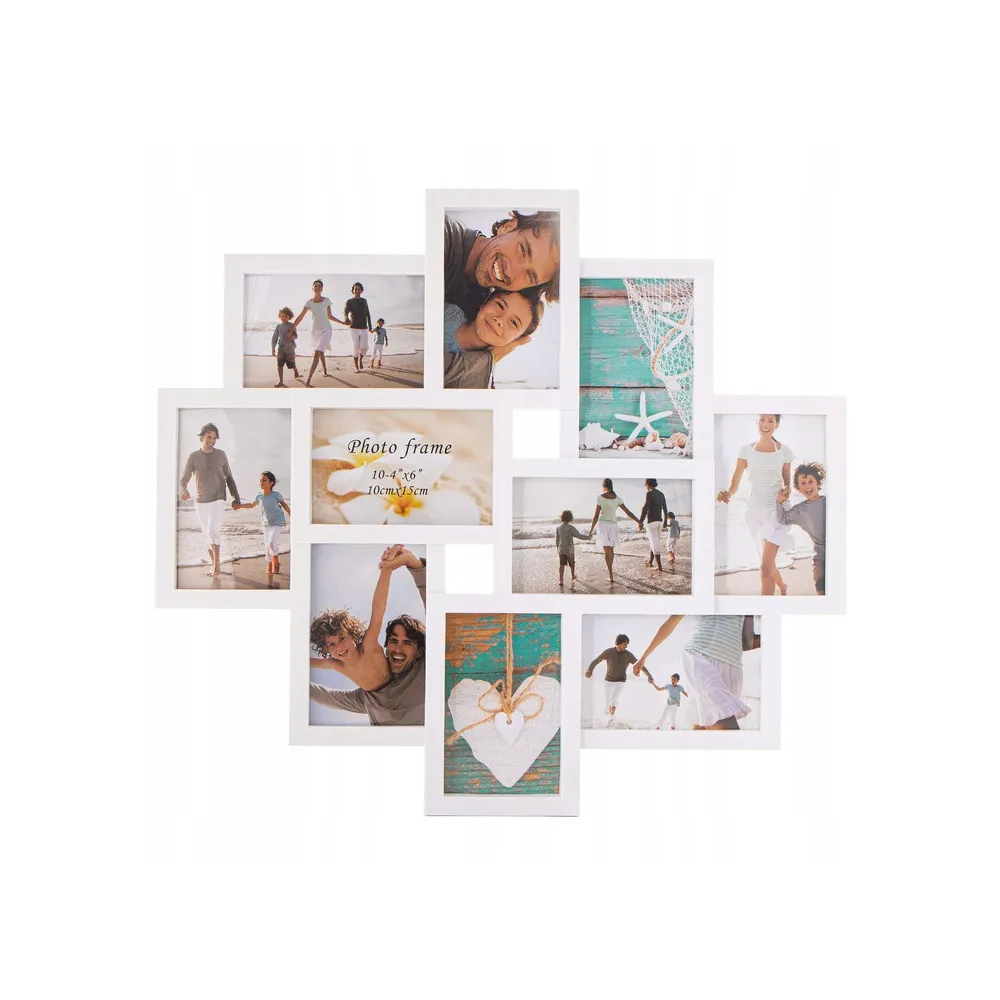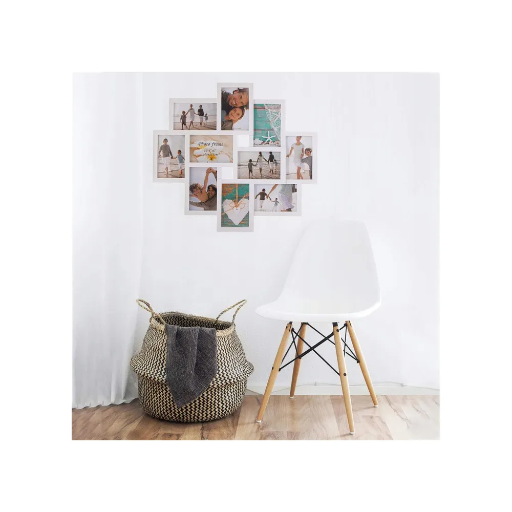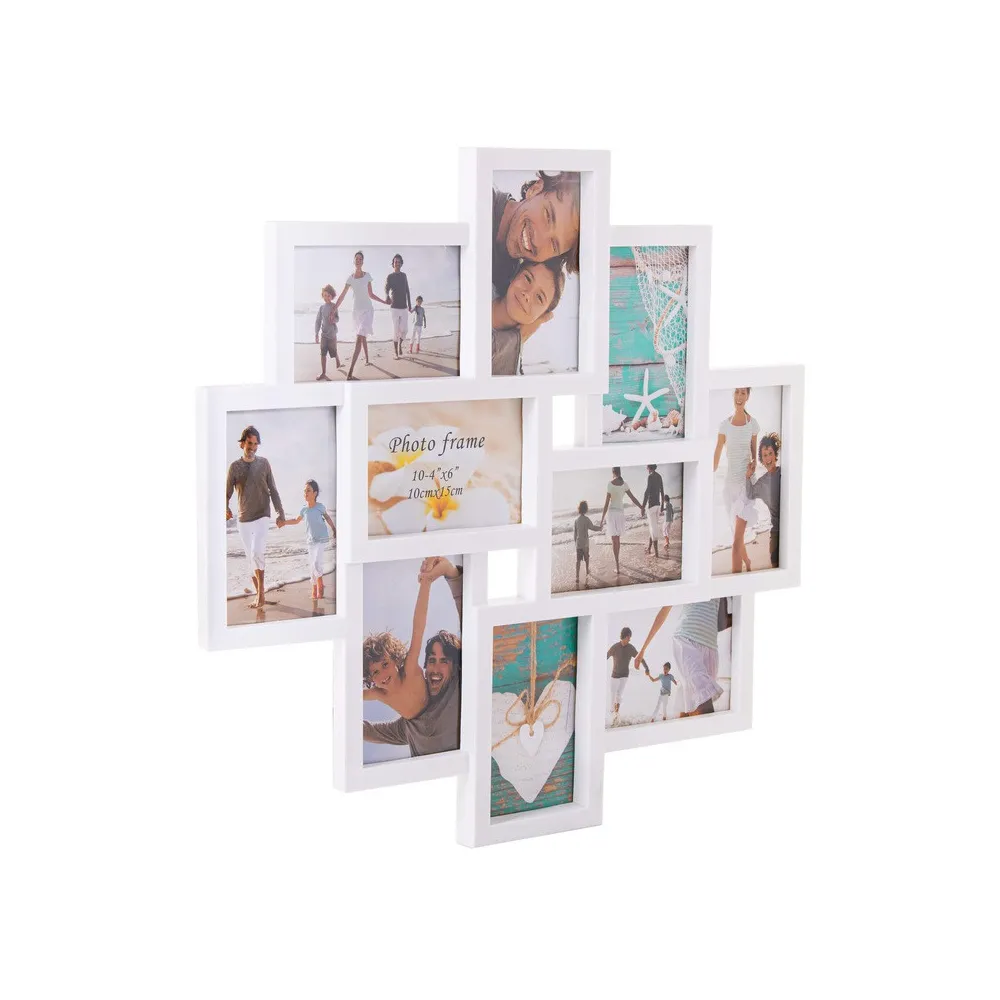 Nástenný rámček pre 10 fotografií vo formáte 10x15 cm. Vodorovné aj zvislé uchytenie na stenu, ľahká výmena fotografií. Veľmi ľahké, napriek tomu odolné prevedenie, pútavý vzhľad. Celkové rozmery 53x49 cm.
