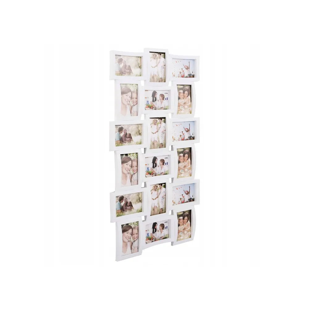 Nástenný rámček pre 18 fotografií vo formáte 10x15 cm. Vodorovné aj zvislé uchytenie na stenu, ľahká výmena fotografií. Veľmi ľahké, napriek tomu odolné prevedenie, pútavý vzhľad. Celkové rozmery 93x47 cm.