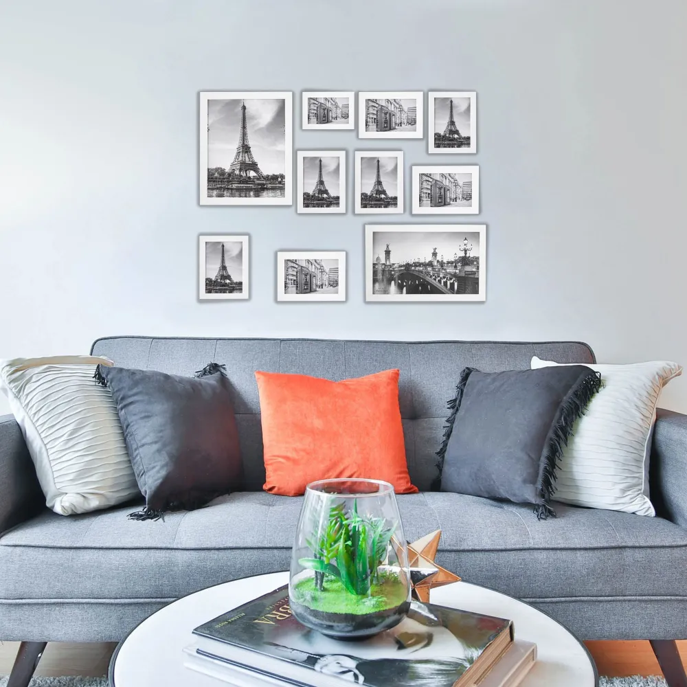 Elegantné fotorámiky o rôznych veľkostiach, sada 12ks. Moderný design, kvalitné spracovanie. Vhodné na kompozície, viac možností usporiadania. Jednoduchá inštalácia, vybavené háčikom, možnosť zavesenia horizontálne aj vertikálne. Skvelé miesto pre vaše spomienky.