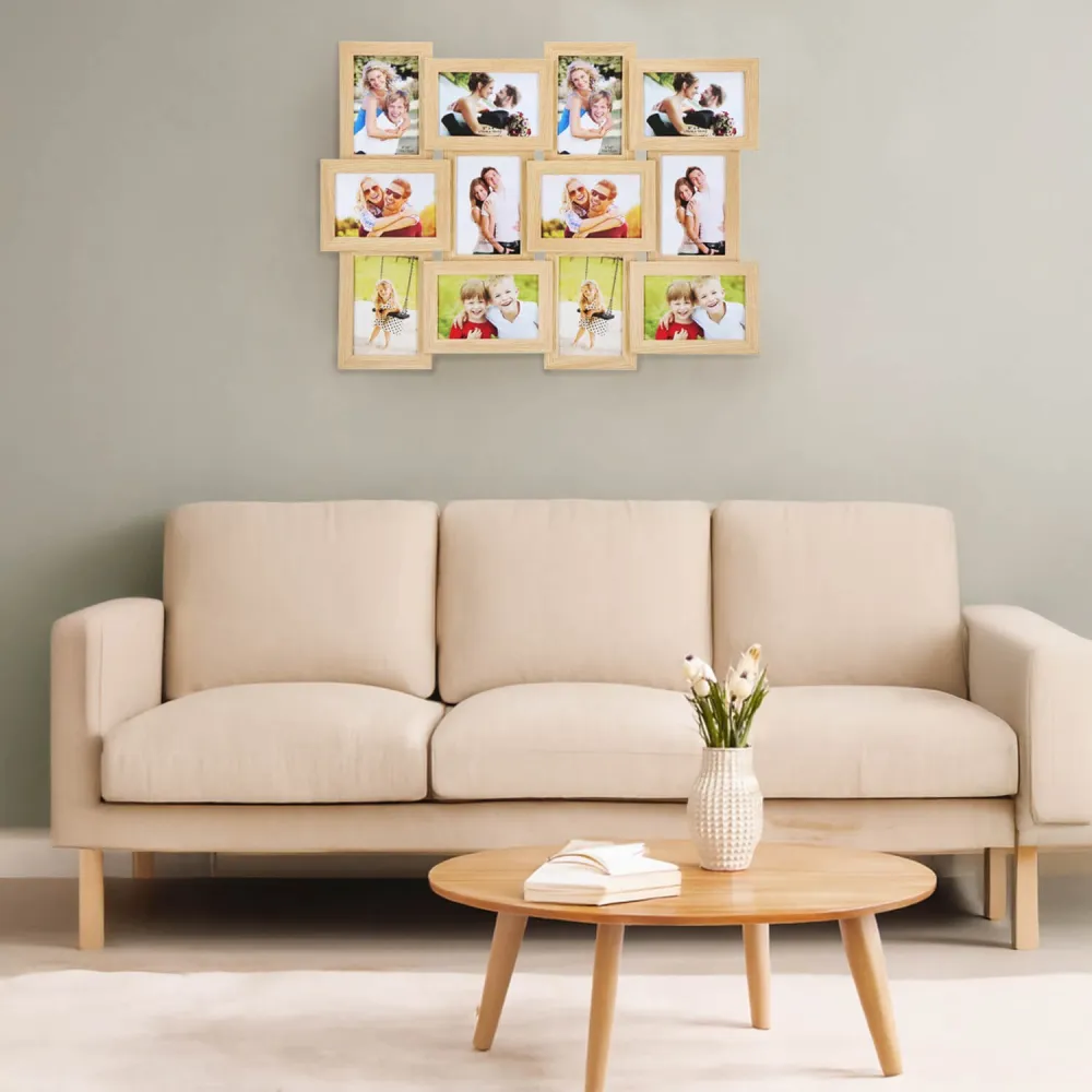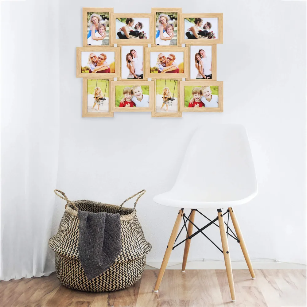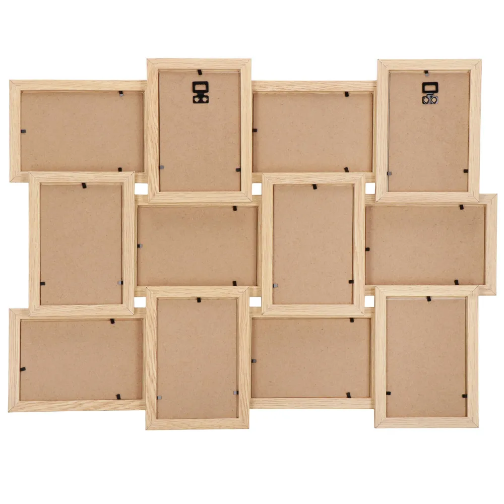 Štýlový fotorámik v imitácii svetlého dreva, do ktorého ľahko umiestnite 12 fotografií formátu 15x10 cm v kombinácii na výšku aj na šírku. Fotografie sa v ňom elegantne naaranžujú tak, aby pôsobili úhľadne a atraktívne. Vďaka jednoduchému systému vloženia zo zadnej strany a praktickým úchytom na vodorovné zavesenie sa stane ideálnym doplnkom každého interiéru.