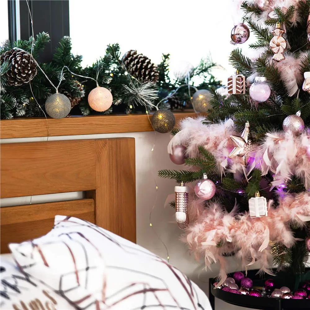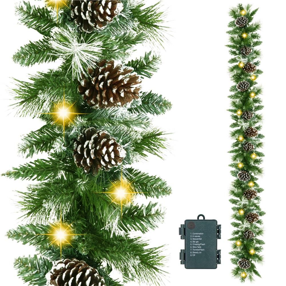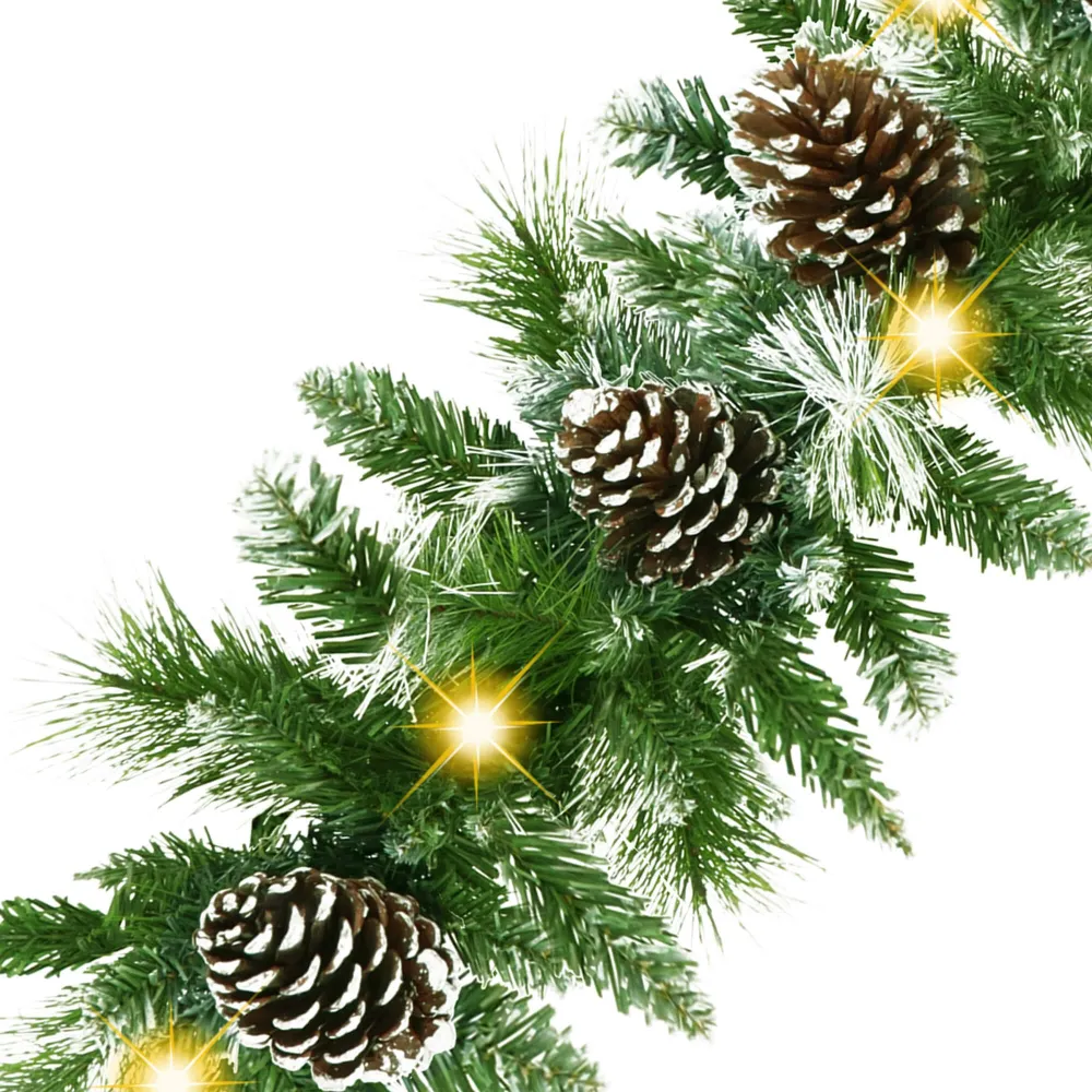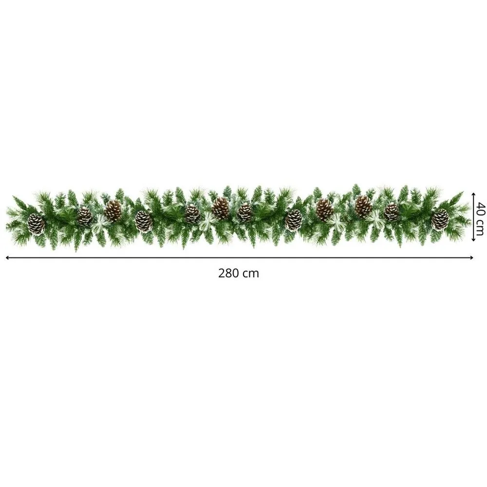 Prémiová girlanda z umelých vetvičiek so šiškami a LED osvetlením. Dĺžka 2,8 m, šírka 40 cm, 50 LED diód napájaných na batérie. Reťaz má veľmi hustú skladbu vetvičiek pripomínajúcich pravé ihličie. Výborne sa dopĺňa o ďalšie dekorácie, ľahko sa tvaruje aj napája. Osvetlenie má 8 režimov svietenia. Táto vianočná dekorácia bude vyzerať skvele, nech ju dáte na stromček, omotáte okolo zábradlia, trámov alebo použijete ako základ pre vianočné aranžmány.