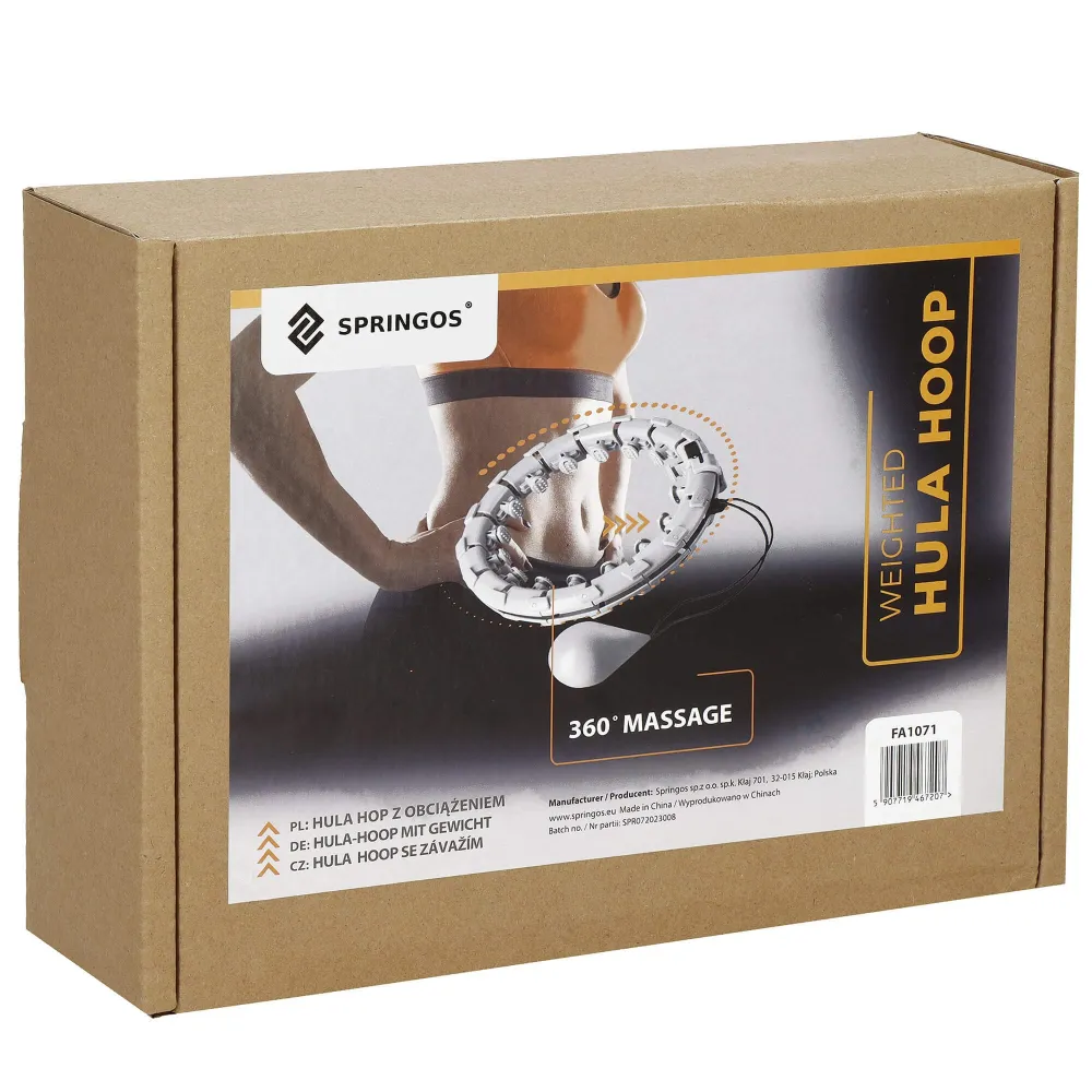 Značka Springos®. Modrá farba. Materiál: plast. 360 ° fitness masáž. Počet masážnych výstupkov: 24. Počet komponentov: 24 spojovacích sekcií + 1 závažie. Produkt pre vlastnú montáž. Rozmery: Priemer: 47 cm. Šírka obruče s výstupkami: 3,9 cm. Dĺžka opasku so závažím: 39 cm. Priemer závažia: 6,9 cm. Rozmery masážneho hrotu: 1,9 x 3,1 cm. Dodatočné informácie: Cvičenie hula hoop pomáha precvičovať brušné, bedrové a bedrové svaly. Spojovaciu sekciu je možné odpojiť. Balené v štýlovom, originálnom balení.