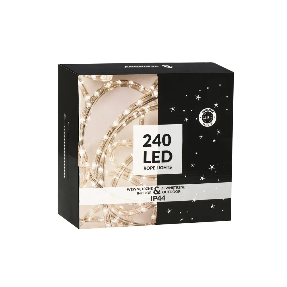 LED svetelná hadica s programátorom a 8 svetelnými funkciami. Úsporné ľad diódy, vnútorné aj vonkajšie použitie, vodeodolné prevedenie, krytie IP44. Dĺžka svetelnej časti 10 m, napájací kábel 1,5 m. Farba teplá biela, 240led.