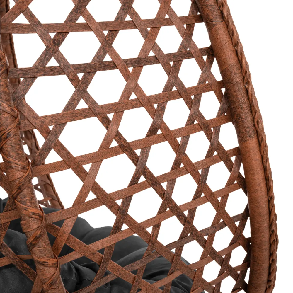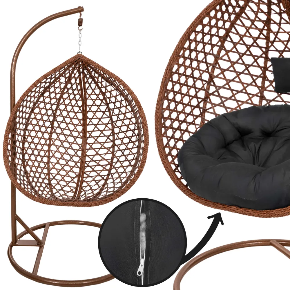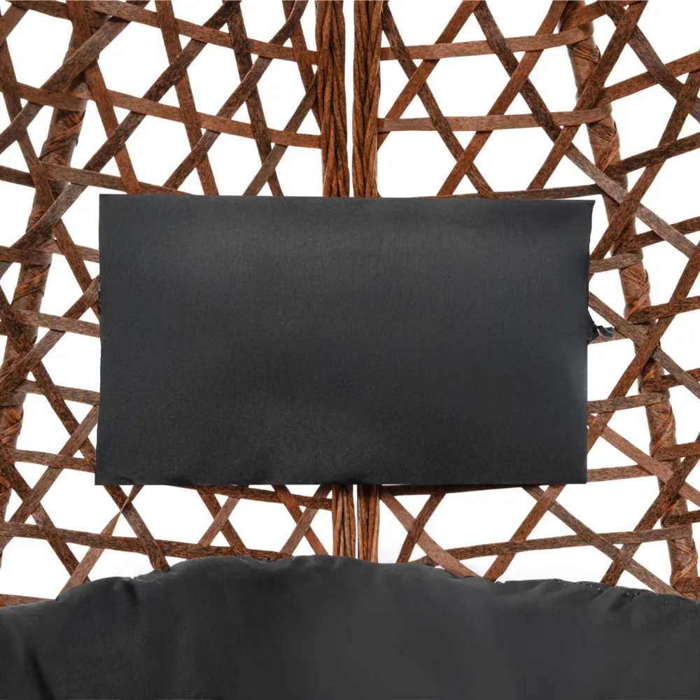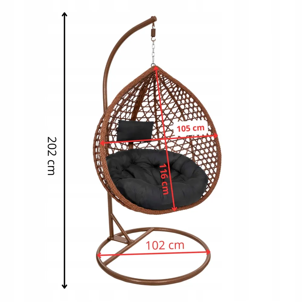 Závesné hojdacie kreslo v tvare vajíčka ponúka prepychový priestor na chvíle relaxácie a odpočinku. Výplet koša je zhotovený z ručne pleteného masívneho technoratanu . Pre komfortný odpočinok je kreslo vybavené pohodlným extra veľkým vankúšom a opierkou hlavy. Vankúš je opatrený zipsom a vyplnený mäkkou penovou vatou. Na dotyk príjemný poťah vankúša je možné v prípade potreby sňať a kedykoľvek vyprať v práčke.