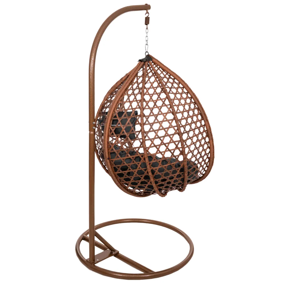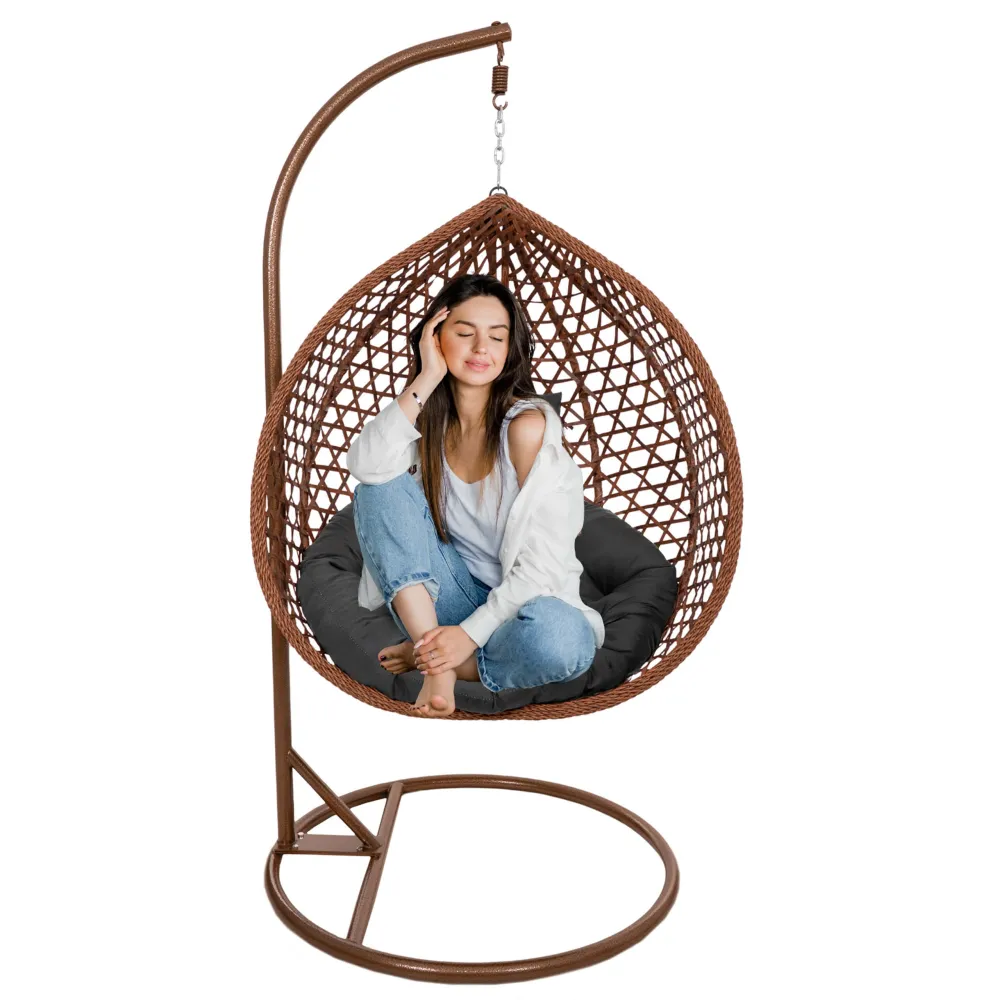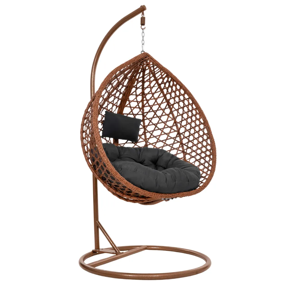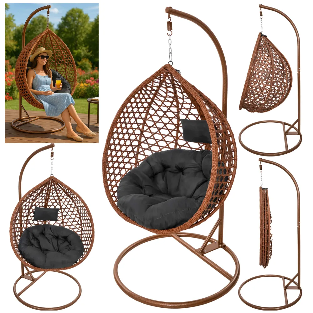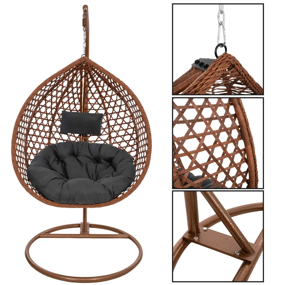 Závesné hojdacie kreslo v tvare vajíčka ponúka prepychový priestor na chvíle relaxácie a odpočinku. Výplet koša je zhotovený z ručne pleteného masívneho technoratanu . Pre komfortný odpočinok je kreslo vybavené pohodlným extra veľkým vankúšom a opierkou hlavy. Vankúš je opatrený zipsom a vyplnený mäkkou penovou vatou. Na dotyk príjemný poťah vankúša je možné v prípade potreby sňať a kedykoľvek vyprať v práčke.