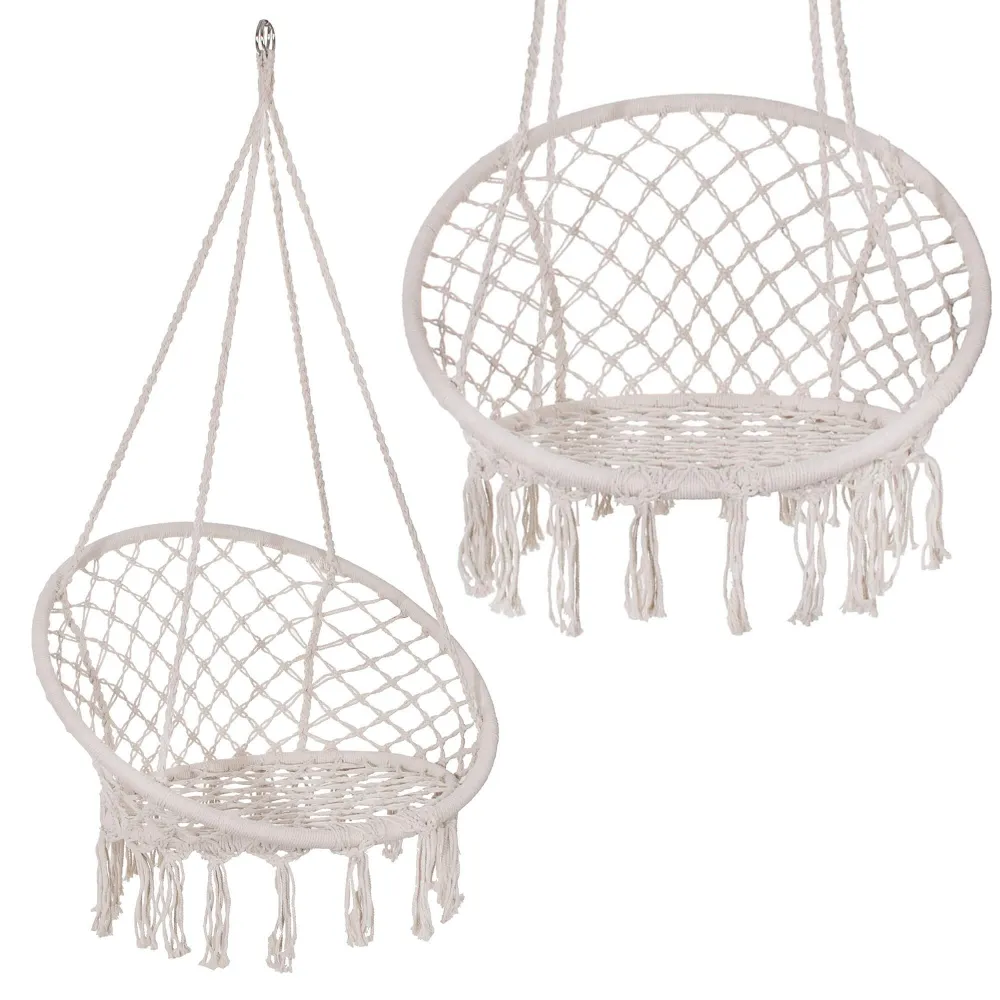 Závesné hojdacie kreslo v provensálskom štýle. Originálny, tkaný tvar, v krémovej farbe. Ľahká, napriek tomu veľmi pevná konštrukcia. 2 možnosti montáže. Závesné strapce v boho štýle, bezpečné, ideálne aj pre deti.