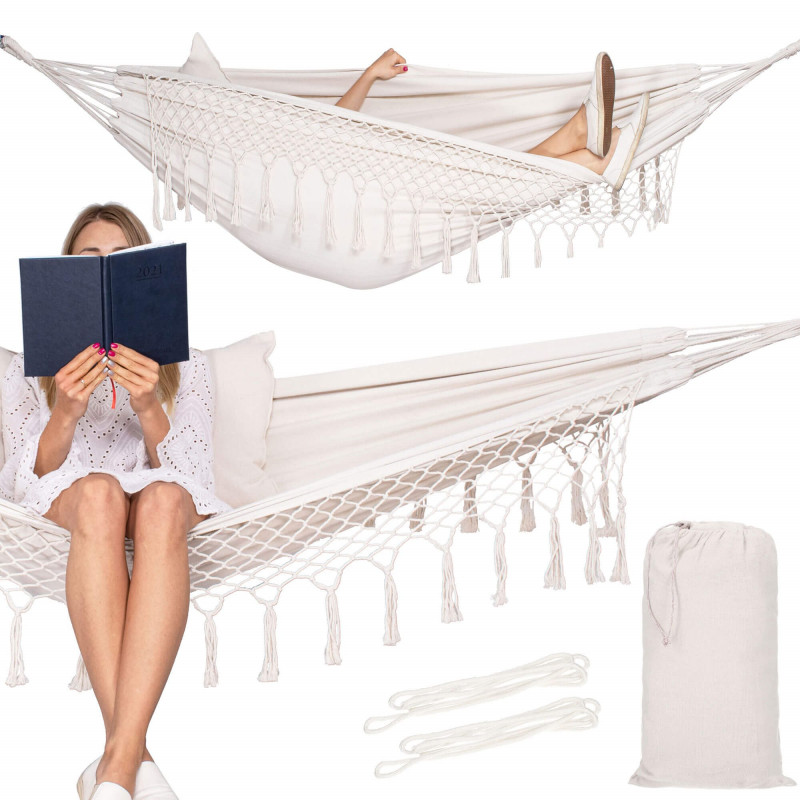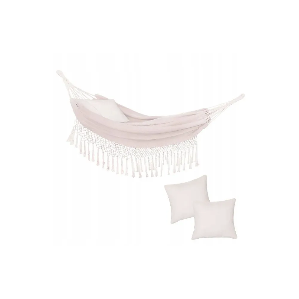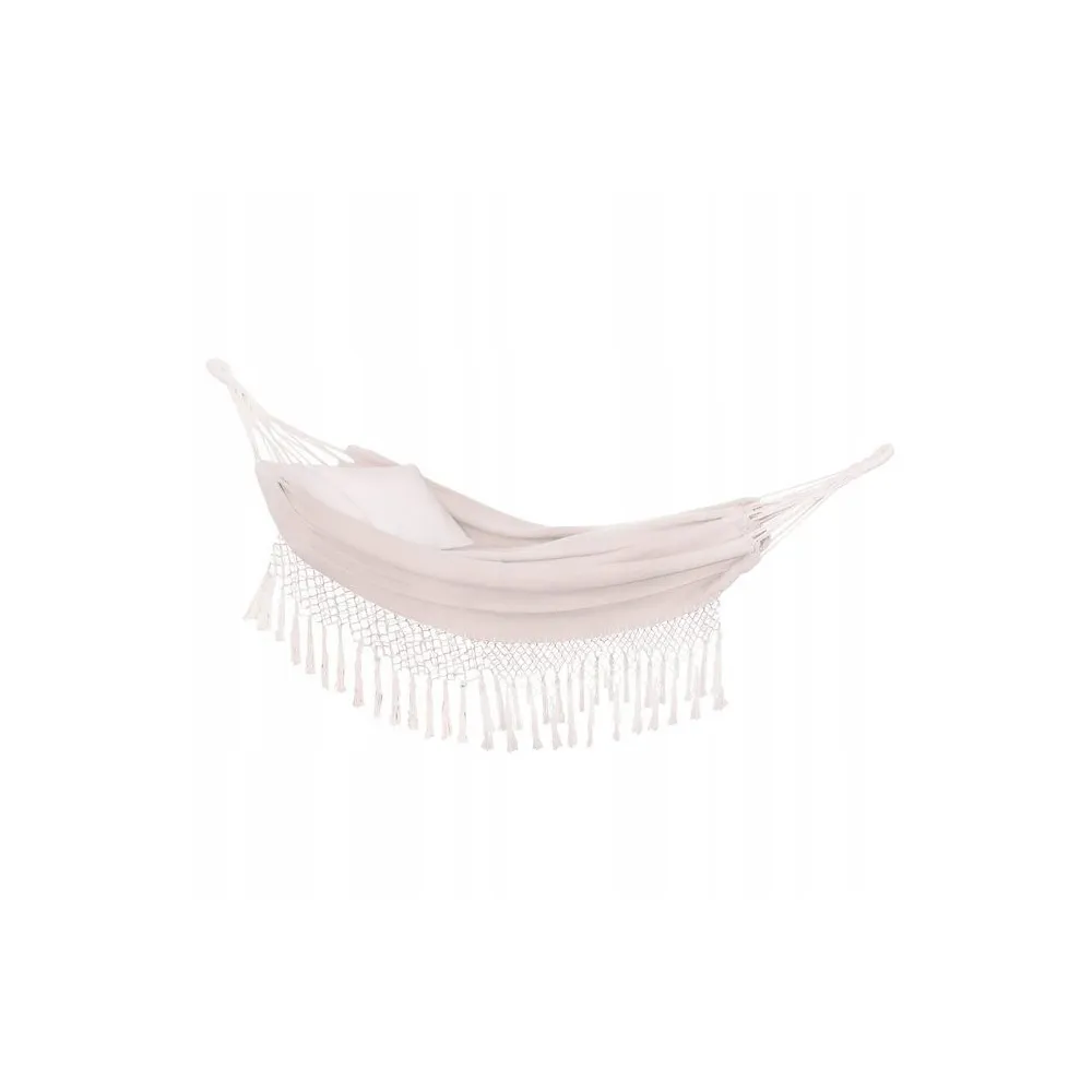Hamaka je perfektný nápad, ako stráviť voľný čas v pohodlí domácej záhrady alebo terasy . Maximálna nosnosť 200 kg, vhodné pre 2 osoby, módna béžová farba. Vyrobené z bavlny s prímesou polyesteru, priedušná štruktúra, pohodlný materiál. Veľký rozmer, módne strapce, ľahká hmotnosť, ľahko sa prenáša.